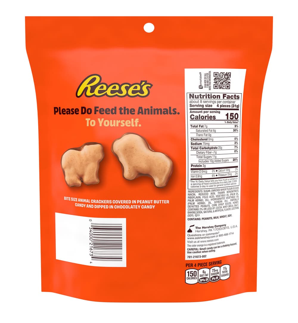 Completely covered in a thick layer of peanut butter candy and half dipped in milk chocolate, these Reese's dipped animal crackers seem too good to be true! With the bottom side of each cracker coated in milk chocolate, these peanut butter candy treats are the perfect combination of sweet chocolate, creamy peanut butter candy and crunchy animal crackers to indulge your taste buds. Pack a bag in your purse or backpack, store some in your pantry or fill your favorite covered candy jar to the brim with Reese's candy. These bite size animal crackers are perfect to snack on no matter what you get up to, whether you enjoy unwinding in front of your favorite TV show or exploring the great outdoors. Reach in, grab a handful and enjoy the bliss of crisp animal crackers smothered in peanut butter candy and classic milk chocolate. Get creative in the kitchen and use these animal crackers to top brownies, cookies, cupcakes and ice cream sundaes. These tasty dipped animal crackers are perfect for celebrating the holidays, too. Share the goodness by loading Easter baskets, filling Christmas stockings, packing Halloween candy tables and creating the sweetest Valentine's Day gift bags. Just don't forget to save a bag for yourself during all that sharing! Contains one (1) 8.5-ounce bag of Reese's Milk Chocolate and Peanut Butter Candy Dipped Animal Crackers in a pouch bag Grab a handful of bite size animal crackers covered in peanut butter candy and dipped in milk chocolate during your favorite TV series, while running errands or as a midday treat Certified kosher dipped animal crackers for easy snacking and sharing with your best mates