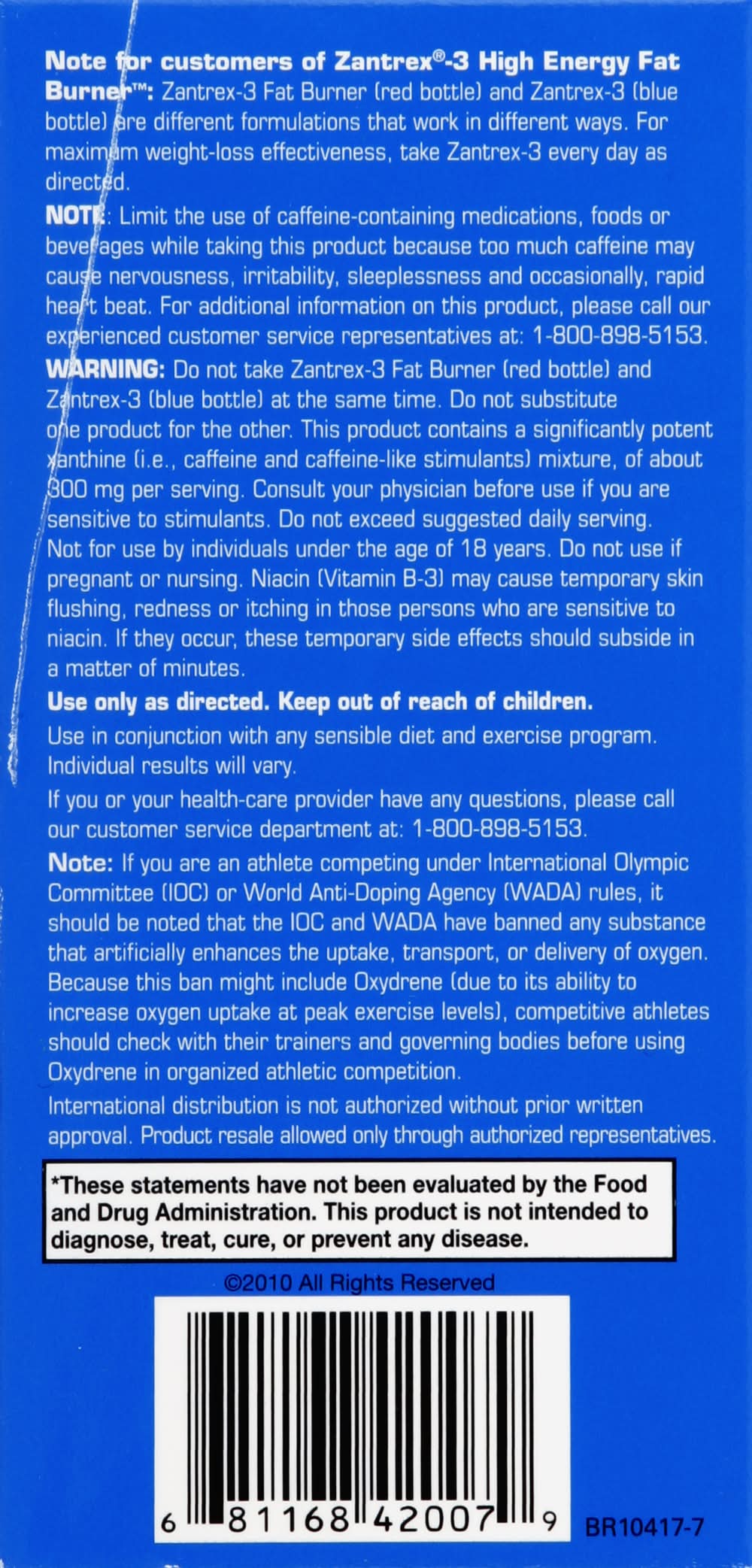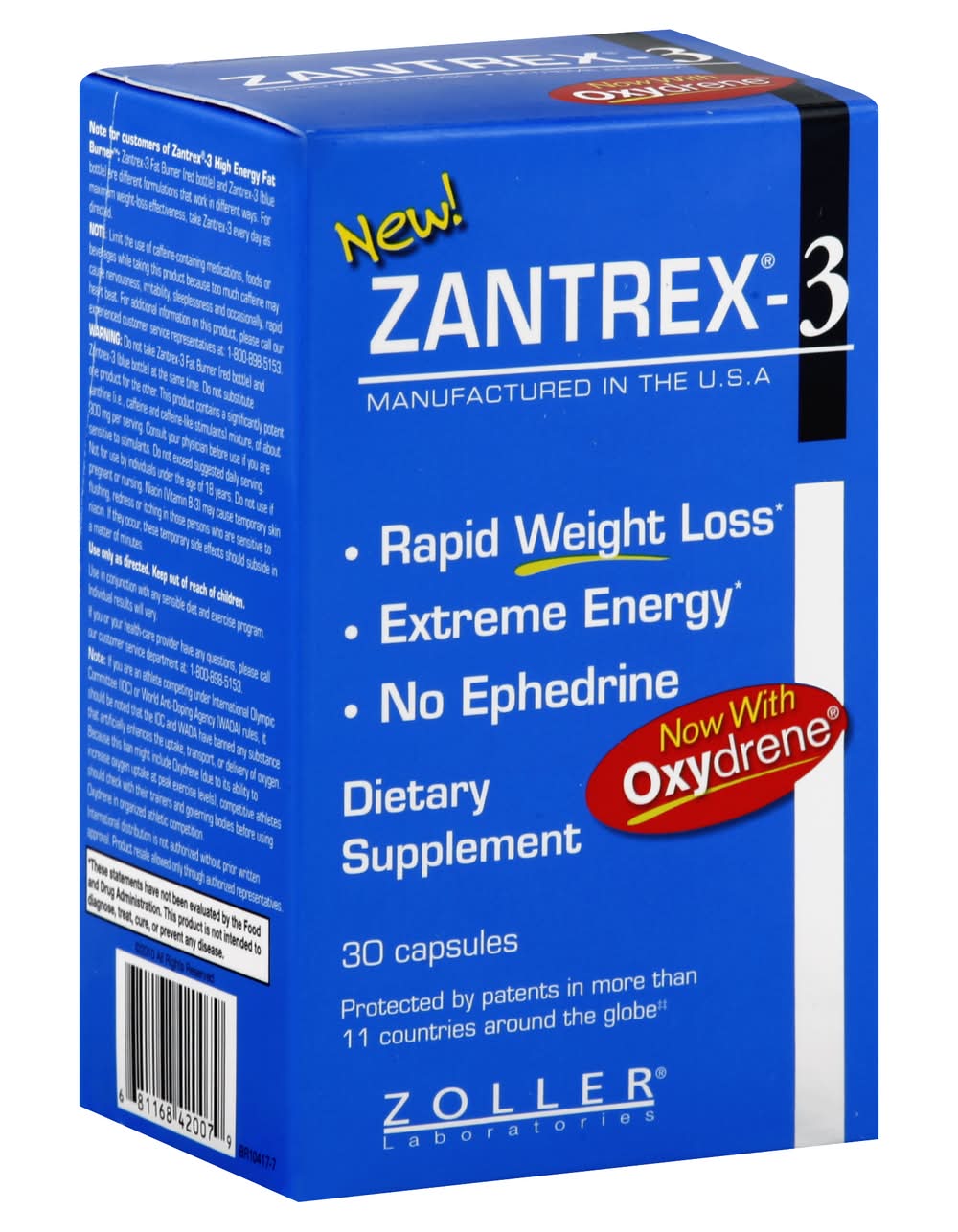 Dietary Supplement. Rapid weight loss. Extreme energy. No ephedrine. Now with oxydrene. Protected by patents in more than 11 countries around the globe. 546% more weight loss (the 546% more weight loss claim is based solely on Zantrex-3's active weight-loss component) than America's number 1 selling ephedra-based diet pill. Published clinical studies don't lie. While it's difficult to compare scientific studies because of inherent design variance, here are the facts: the proof (for additional study details visit Zatrex3.com) - Zantrex-3 vs. America's number 1 selling ephedra-based diet pill. Their study (for additional study details visit Zatrex3.com): 8 weeks taking America's best seller with diet and exercise: the results: the study showed that subjects who used America's best seller for 8 weeks experienced an average weight loss of 4.8 ounces per week more than the placebo group. Yes, you heard right - four point eight ounces. That's less than one-third of a pound per week better than placebo, for 8 weeks - a grand total of less than 2 and 1/2 pounds of additional weight loss after 56 days and nights of diet and exercise when compared to a sugar pill. Our study (for additional study details visit Zatrex3.com): 45 days (6.4 weeks) taking the active formula in Zantrex-3 without diet and exercise: The Results: Subjects using the proven active formula in Zantrex-3, for a little over 6 weeks, experienced an average weight loss of a whopping 11.2 pounds - 1696% more weight loss than the placebo group, and 546% more weight loss per week (the 546% more weight loss claim is based solely on Zantrex-3's active weight-loss component) (over and above placebo - of course) than the entire group of people who used America's best seller - and that's without having to follow any prescribed diet plan or supervised exercise program! That's the power of the active Zantrex-3 formula. Note for customers of Zantrex-3 high energy fat burner: Zantex-3 fat burner (red bottle) and Zantrex-3 (blue bottle) are different formulations that work in different ways. For maximum weight-loss effectiveness, take Zantrex-3 every day as directed. This product is manufactured to be within all acceptable industry variances. (These statements have not been evaluated by the Food and Drug Administration. This product is not intended to diagnose, treat, cure or prevent any disease.) Manufactured in the USA. Zoller,