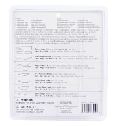 This craft knife set contains three handles: heavy duty, medium and standard use with 13 interchangeable assorted blades. 8.85" x 7.68" (22.4cm x 19.5cm) package size . 16 pieces . Includes a case with a magnetic strip to keep extra blades stored . Carbon steel, plastic and aluminum . 3 fine precision blade 3 angled chisel blade . 3 angled chisel blade 2 chisel blade