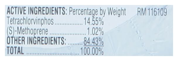 Active Ingredients: Percentage by Weight: Tetrachlorvinphos (14.55%); (S)-Methoprene (1.02%); Other Ingredients: (84.43%); Total 100.00%