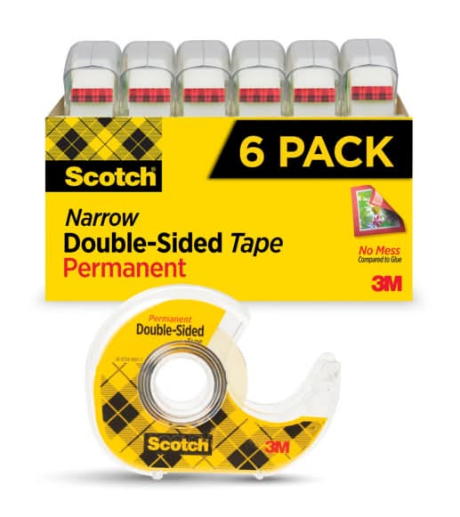 For the light duty attaching you do for activities around the house, get it done fast and get it done right without the drips, clogs and air bubbles of glue. Scotch® Double Sided Tape the neat, clean, strong and long lasting way to take care of school projects, scrapbooks, photo albums all those important presentations that need to come together. Scotch® Double Sided Tape is easy to use and won't create a mess like the way glue does. It smoothly glides off the easy to use Scotch® Tape dispenser (included), cuts cleanly and right where you want to cut so no waste. For a better way to present all the wonderful things in life. Both sides coated with permanent adhesive No glue mess Cleaner way to create and craft presentations for home and for school vs. glue Holds things together without being seen Dispenser included: Refills easily, stores away conveniently, always ready Photo safe No liner Great for activities like crafting, scrapbooking, making cards and creating presentations Easy-to-apply design that doesn't dry out 1/2 in. x 500 in, 6 Rolls, 1 in. Core Made in the USA with Globally Sourced Materials Tape contains 18% bio-based content (derived from cellulose) by weight ACMI Certified AP Nontoxic. For detailed information see www.acmiart.org. Less harsh chemicals - made with fewer harsh chemicals, or safer chemicals than typical alternatives, helping reduce your use of and exposure to substances that may be more harmful to your health and the environment. • Pack size: 6 • Color: Clear