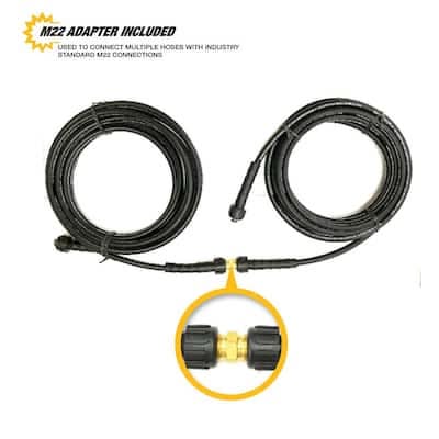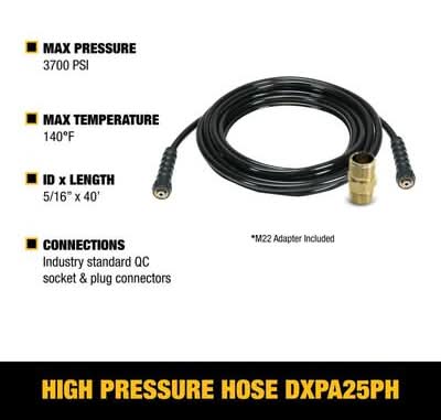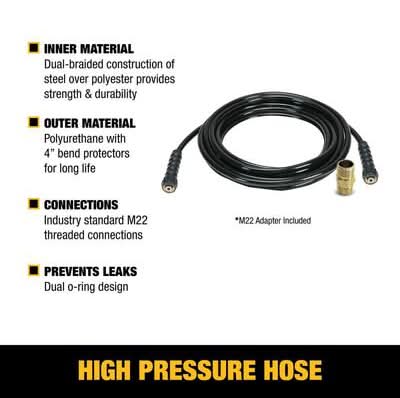 DEWALT hose technology is designed to be highly flexible and kink resistant. Our hose has a polyurethane outer jacket that is non-marring and abrasion-resistant for improved durability; the 4-inch bend protectors on each end of the hose help extend the life of the hose. This is a cold water hose that is equipped with industry-standard M22 threaded connections with a dual o-ring design to fit most gas and electric pressure washers up to 3700 PSI. Cancer and Reproductive Harm - www.P65Warnings.ca.gov Size: 5/16" X 40 Ft