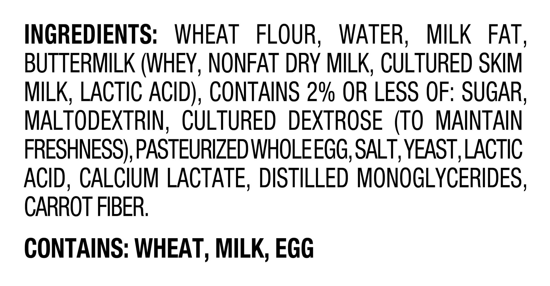 Wheat Flour, Water, Milk Fat, Buttermilk (Whey, Nonfat Dry Milk, Cultured Skim Milk, Lactic Acid), Contains 2% Or Less Of: Sugar, Maltodextrin, Cultured Dextrose (To Maintain Freshness), Pasteurized Whole Egg, Salt, Yeast, Lactic Acid, Calcium Lactate, Distilled Monoglycerides, Carrot Fiber. Contains: Wheat, Milk, Egg Contains: Contains: Wheat, Milk, Egg Additives: None
