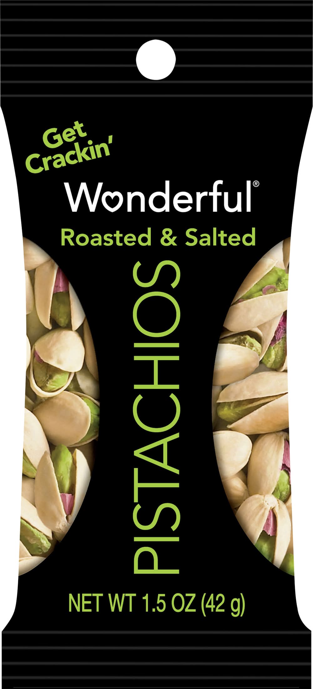 Crack into a good source of plant protein with tasty, healthy wonderful pistachios. With six grams of protein and three grams of fiber in each delicious serving, it’s the perfect plant-based power-up. • Flavor: Roasted & salted • Wonderful pistachios, Lost Hills,CA,93249