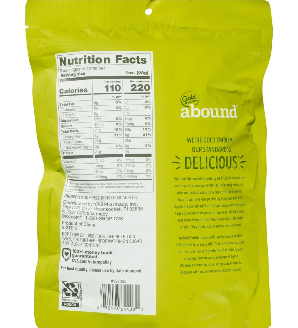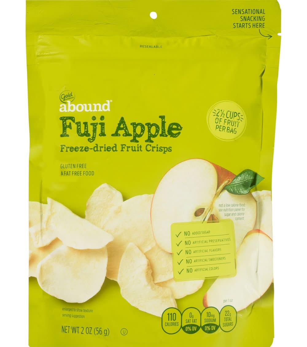 Abound Fuji Apple Dried Fruit is a delectable snack made from premium Fuji apples, which are freeze-dried into light and flavorful crisps. These fruit crisps come in a resealable bag that contains approximately 2.5 cups of fruit, offering a convenient and tasty option for snacking. They are a gluten-free and fat-free food, with no added sugars or artificial ingredients, including preservatives, flavors, sweeteners, and colors. Enjoy these natural, sweet crisps on their own, or add them to oatmeal, cereal, or salads for an extra burst of flavor. Abound Fuji Apple Dried Fruit is crafted with an emphasis on nutritious ingredients that also taste great, providing a simple choice for a nourishing snack.