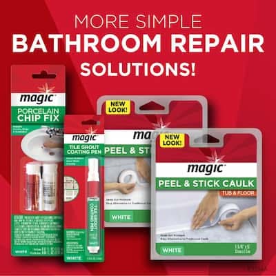 Magic Bath Tub and Wall Peel and Stick Caulk is pre-shaped, flexible trim with pre-applied butyl adhesive. Simply peel and stick to the surface, even over existing caulk. The molded-in score line assures uniform positioning against the surface. It's the perfect finishing touch to refresh or update your bathtub or wall trim. Magic offers a line of quick fixes for your bathroom, some of the things we offer are Tub and Floor Peel and Stick Caulk, Tub and Wall Peel and Stick Caulk, Tile and Grout Coating Pen and more. Recaulking your tub and wall doesn't have to be a pain with Magic Tub and Wall Peel and Stick Caulk. It's designed to provide a flush seal without the usual mess of caulking. Hide stubborn grout stains instantly with the Magic Tile and Grout Coating Pen. This easy-to-use marker makes covering up grout stains a breeze. • Color: White • Size: 1-5/8 In. X 11 Ft