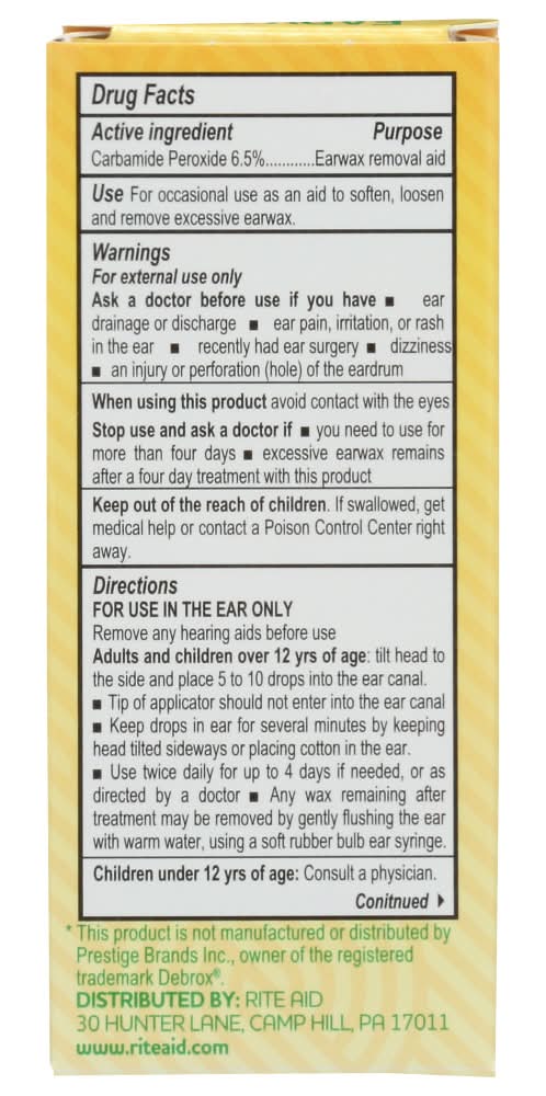 Rite Aid Ear Care Ear Wax Removal Aid goes best with the Rite Aid Earwax Removal Kit. Safe, gentle, and non-irritating, this aid easily cleanses ear with microfoam action. Compare to the ingredients in Debrox.