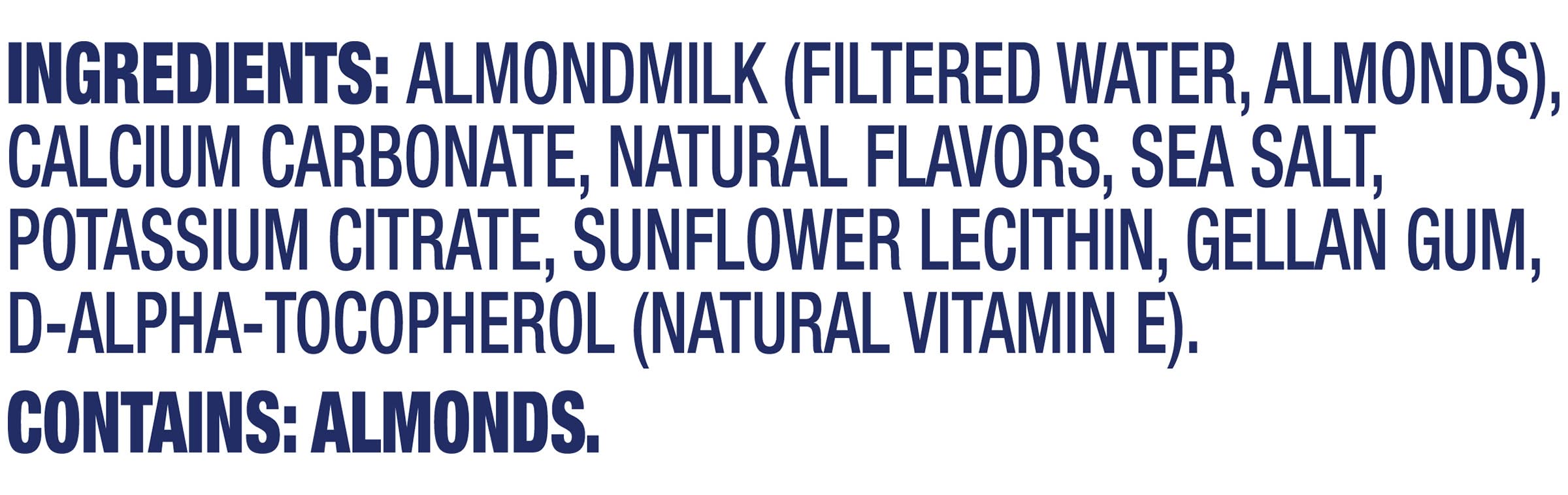 Ingredients: ALMONDMILK (FILTERED WATER, ALMONDS), CALCIUM CARBONATE, NATURAL FLAVORS, SEA SALT, POTASSIUM CITRATE, SUNFLOWER LECITHIN, GELLAN GUM, D-ALPHA-TOCOPHEROL (NATURAL VITAMIN E). Contains: Contains almonds.\nAll products are produced in a stringent allergen control environment.