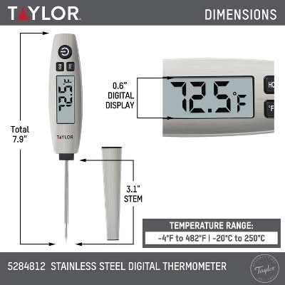 Functional and practical, Taylor’s Digital Instant Read Thermometer delivers accurate food temperature readings in seconds. With the 0.6” LCD display, at-a-glance readings from almost any angle are possible. This kitchen tool performs to the highest performance standards in cooking thermometers. Trust this model’s durable construction, wide temperature range (-4-482°F/-20-250°C), and precise measurement technology to provide only the most accurate food temperature readings. For over a 170 years Taylor has maintained the highest testing standards and quality control of the products that we produce. 1 LR44 battery included. Taylor has been making precision products for kitchen measurement for over 170 years, using only the highest quality components for accurate temperature tracking. Measure precisely in both Fahrenheit and Celsius units for perfect results every time.