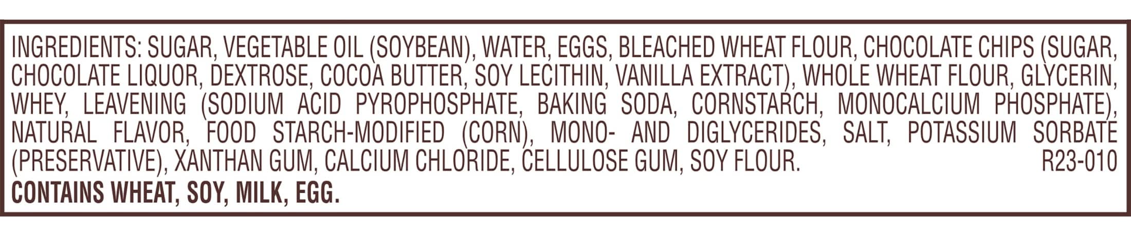 Ingredients: SUGAR, VEGETABLE OIL (SOYBEAN), WATER, EGGS, BLEACHED WHEAT FLOUR, CHOCOLATE CHIPS [SUGAR, CHOCOLATE LIQUOR, DEXTROSE, COCOA BUTTER, SOY LECITHIN, VANILLA EXTRACT], WHOLE WHEAT FLOUR, GLYCERIN, WHEY, LEAVENING [SODIUM ACID PYROPHOSPHATE, BAKING SODA, CORNSTARCH, MONOCALCIUM PHOSPHATE], NATURAL FLAVOR, FOOD STARCH-MODIFIED (CORN), MONO- AND DIGLYCERIDES, SALT, POTASSIUM SORBATE (PRESERVATIVE), XANTHAN GUM, CALCIUM CHLORIDE, CELLULOSE GUM, SOY FLOUR. Contains: CONTAINS EGG, MILK, SOY, WHEAT.