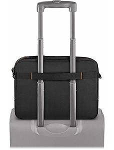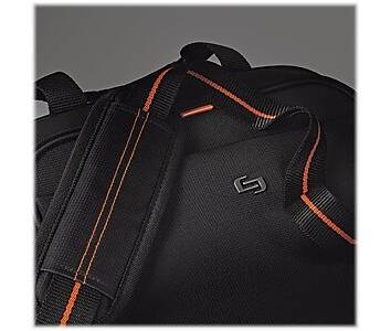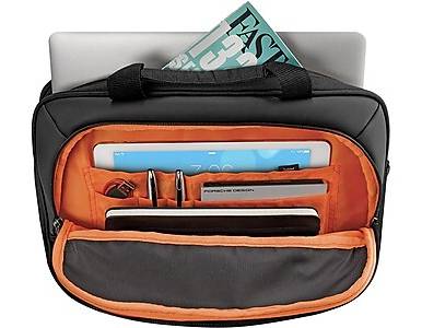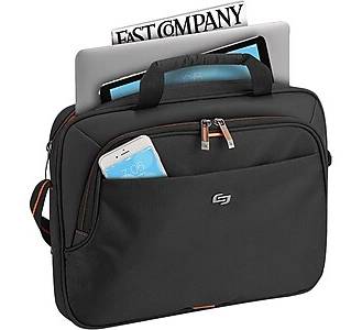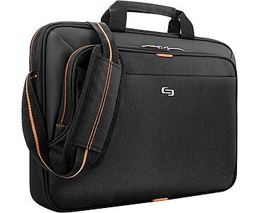 The Solo Ace laptop briefcase is an everyday business bag with a sleek look and smart design. Everyday doesn't have to be boring, so the case is given a dynamic name that conveys the idea of excitement and success in the workplace. - Notebook briefcase keeps your laptop and other work essentials neatly packed - Comes in black polyester with orange accents and orange interior lining - Comfortable handle and adjustable shoulder strap allow for easy portability; the back strap slides over luggage handle - Dimensions: 10.25H x 14W x 2D - Fully padded 13.3 laptop/Chromebook compartment, internal iPad/tablet pocket, full-length front zippered pocket, full-size front zip-down organizer section - 5-year manufacturer limited warranty - ⚠ WARNING: Cancer and Reproductive Harm www.P65Warnings.ca.gov