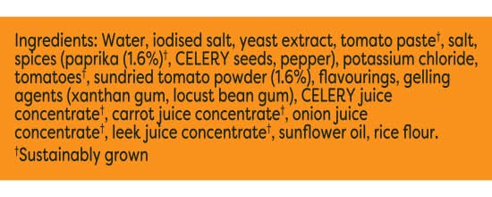 Water, iodised salt, yeast extract, tomato paste†, salt, spices (paprika (1.6%)†, CELERY seeds, pepper), potassium chloride, tomatoes†, sundried tomato powder (1.6%), flavourings, gelling agents (xanthan gum, locust bean gum), CELERY juice concentrate†, carrot juice concentrate†, onion juice concentrate †, leek juice concentrate†, sunflower oil, rice flour. †Sustainably grown Contains: Contains: Celery Additives: None