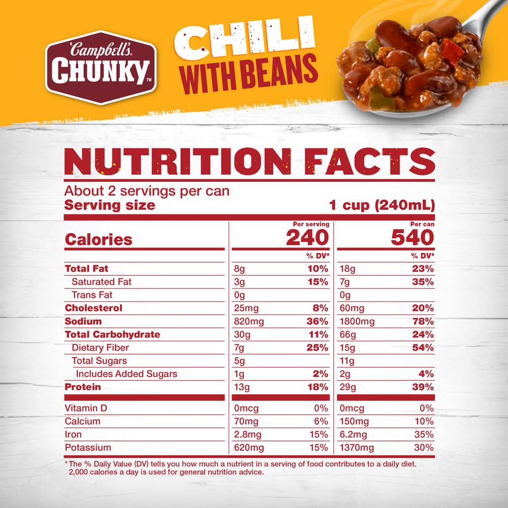 Chunky chili with beans isn’t just tasty it's made to work as hard as you do. With never-ending big flavors and bold ingredients, this comfort food classic is capable of fueling the heartiest appetite. This ready-to-eat chili is crafted with hearty ingredients like kidney beans, seasoned beef and pork, and red and green peppers in a delicious tomato puree. Each serving has 13 grams of protein. Just pop this chili in a microwave-safe bowl, heat and enjoy. Or, warm it over the campfire on your outdoor adventures. Whether you’re looking for quick and easy to microwave chili for home or something to take on the go, campbell’s has you covered. The chili can is recyclable for easy disposal. Enjoy campbell’s chunky chili with beans.