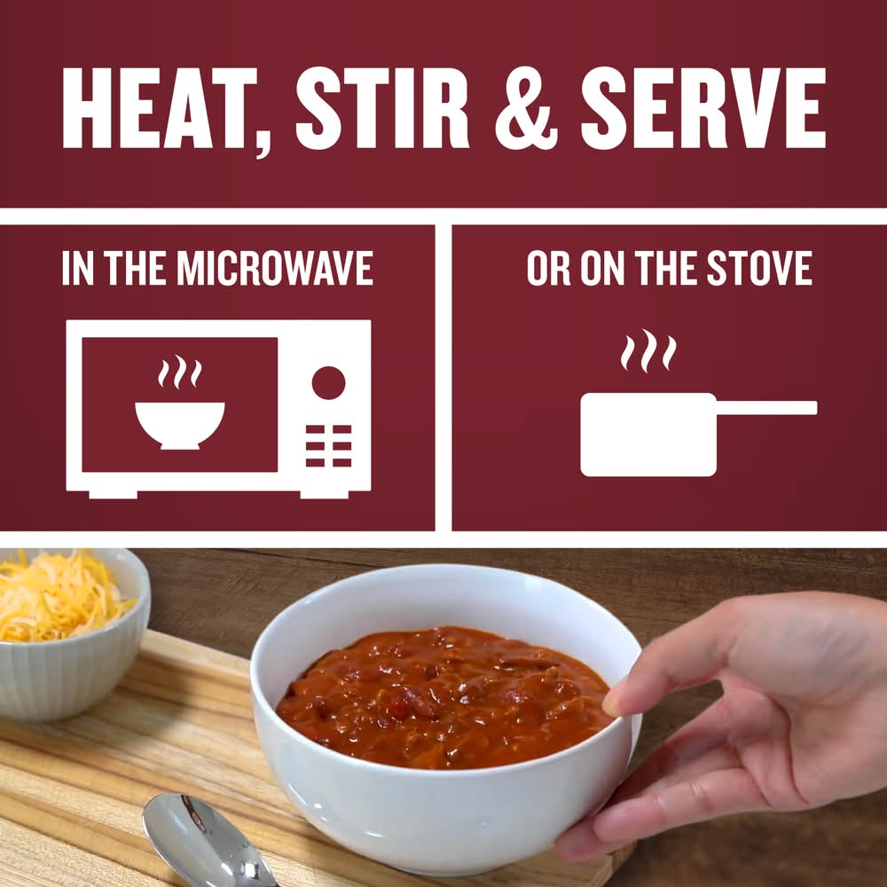 Directions: do not add water. stove pour chili into saucepan. heat, stirring occasionally until hot. microwave: microwave ovens vary. time given is approximate. uneven microwave heating may cause popping, movement of the bowl and/or splattering. 1. heat, covered, in medium microwaveable serving bowl on high 2-1/2 to 3 min. or until hot. 2. careful, leave in microwave 1miun. 3. stir & serve. promptly refrigerate unused product in separate container. caution: metal edges are sharp.quick & easy dinner: just pour over rice.if using can opener, open bottom of can.best if used by date on package.