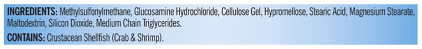 Merthylsulfonylmethane, Glucosamine Hydro Chloride, Cellulose Gel, Hypromellose, Stearic Acid, Magnesium Stearate, Maltodextrin, Silicon Dioxide, Medium Chain Triglycerides Contains: Crustacean Shellfish, Crab, Crustacean Shellfish, Shrimp