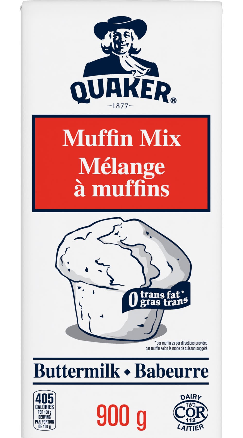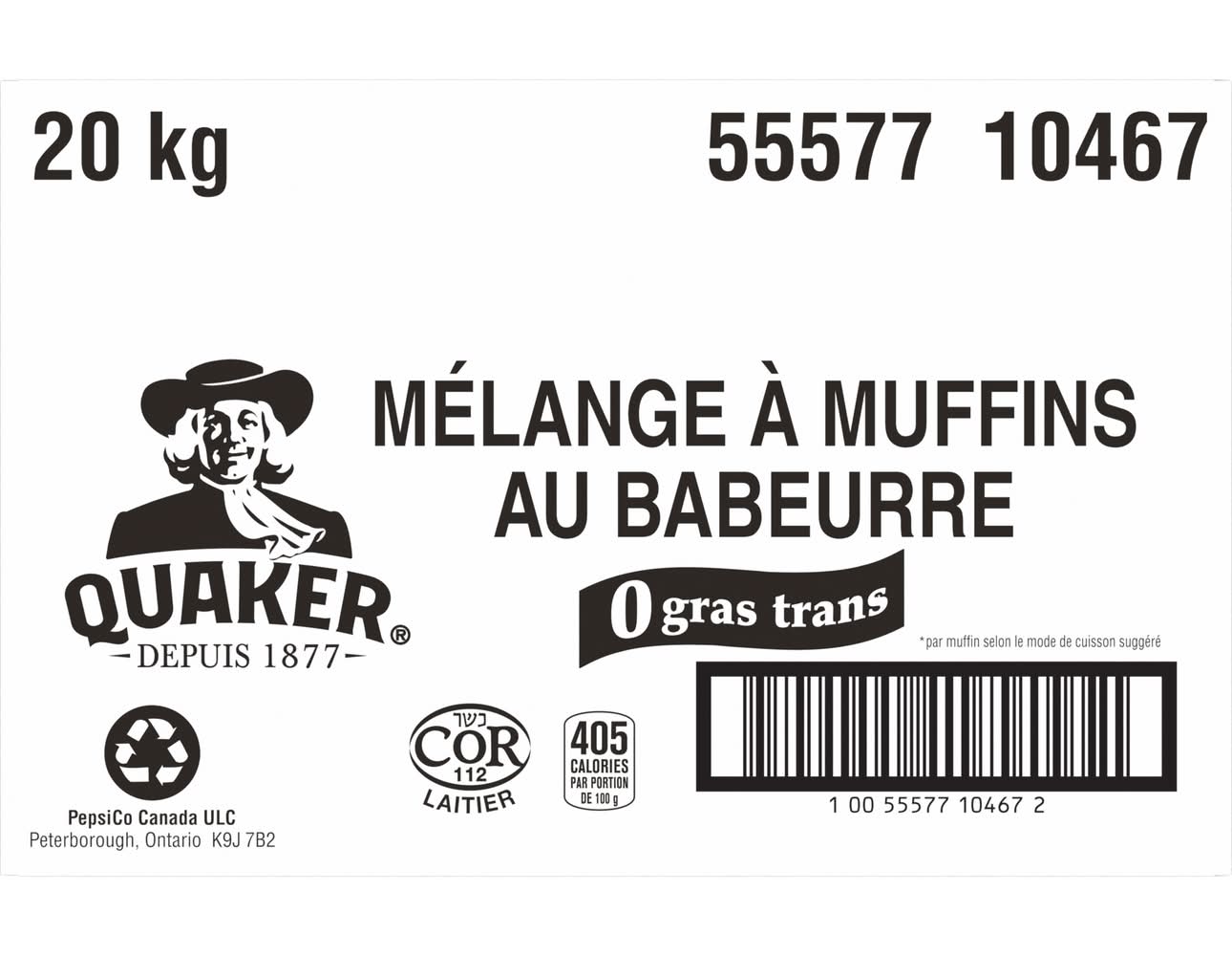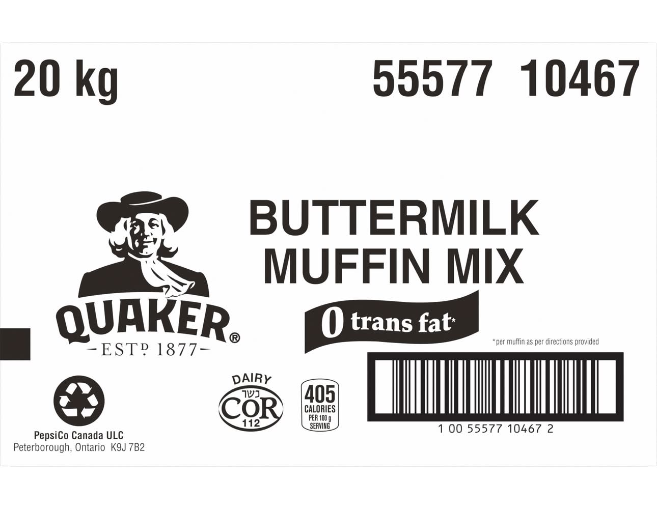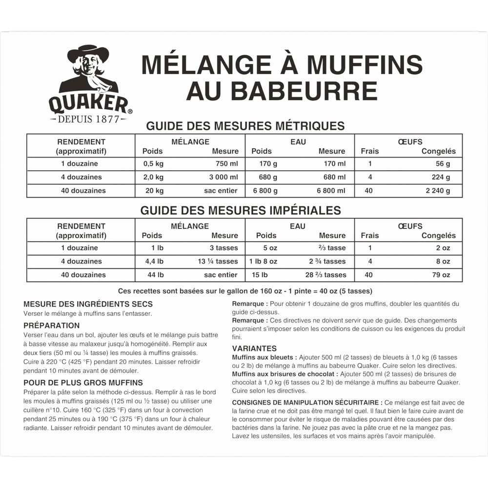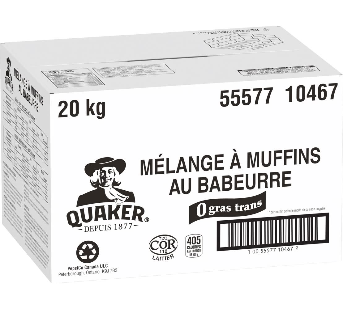 QUAKER MUFFIN MIX BUTTERMILK 20KG • PepsiCo (Canada), Consumer Affairs 14 Hunter Street East Peterborough, Ontario K9J 7B2 • Packaging: Reusable