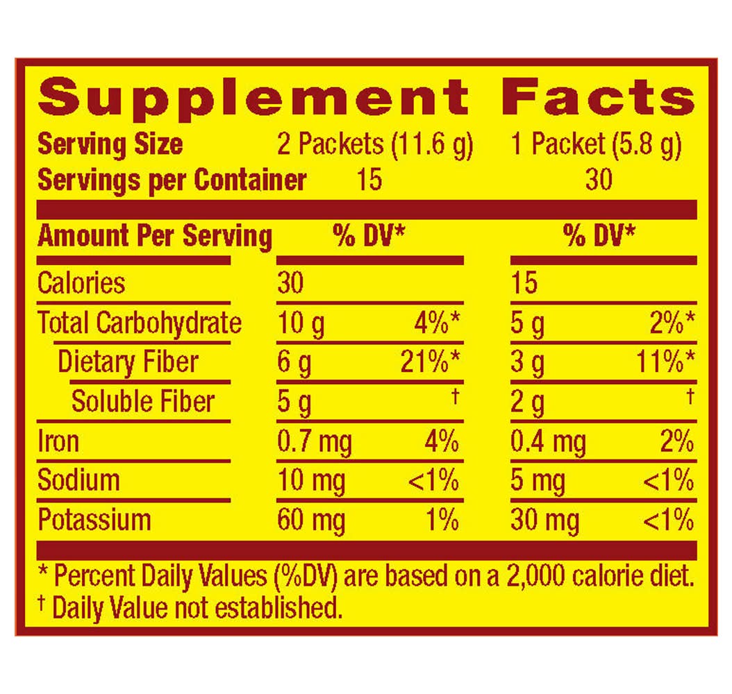 Ingredients: Psyllium Husk, Maltodextrin, Citric Acid, Natural and Artificial Orange Flavor, Aspartame, Yellow 6