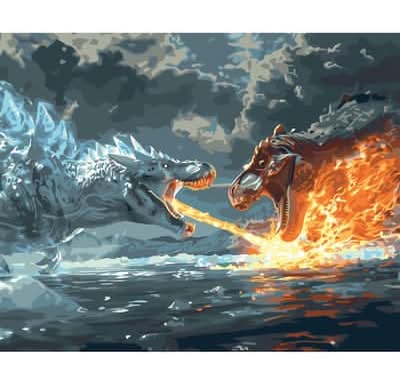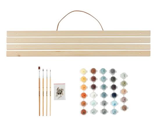 Complete with brushes, numbered paint pots, a pre-printed canvas sheet and a wooden hanger for display, this kit has everything needed to paint a ferocious battle between two dinosaurs. Dinosaur Battle design. 20" x 16" (50.8cm x 40.6cm) finished size. 1,339 numbered sections. Instruction sheet included. Some assembly required for display hanger.