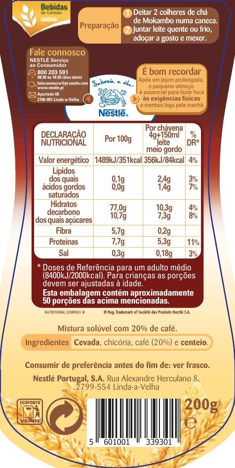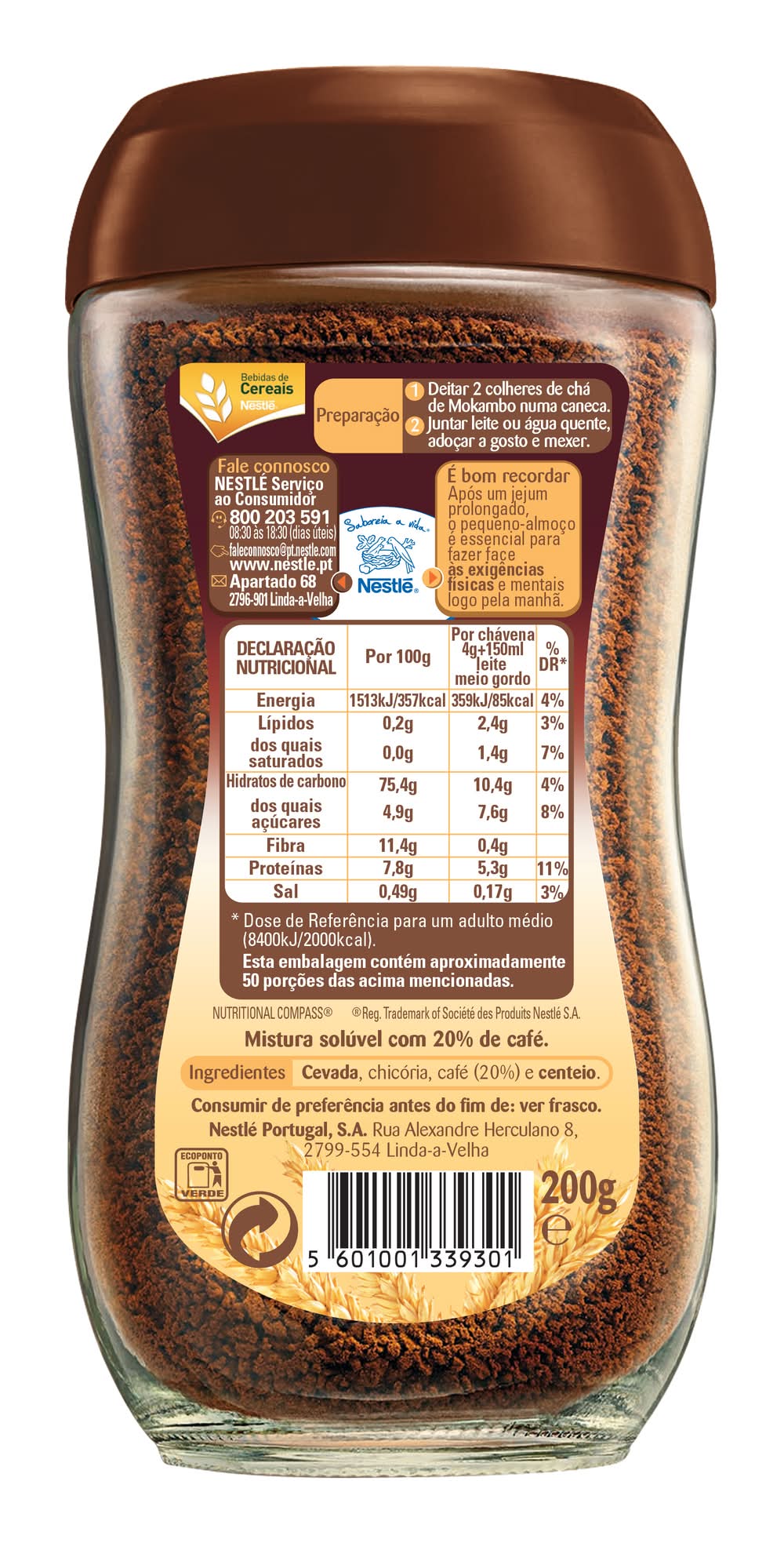 Directions for use: 1. Deitar 2 colheres de chá de Mokambo numa caneca. 2. Juntar leite ou água quente, adoçar a gosto e mexer, Storage recommendation: Conservar em local fresco e seco.