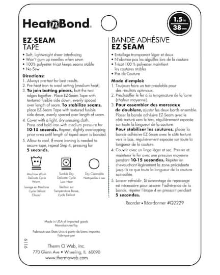 Use this Heatn Bond EZ-SEAM tape to join batting pieces in under a minute for easy sewing. Clear . 1.5" x 15 yd. (3.81 cm x 13.7 m) . Soft and lightweight . Permanent . Won't gum up needles when sewn . Polyester tricot interfacing Size: 1.5" X 15Yd