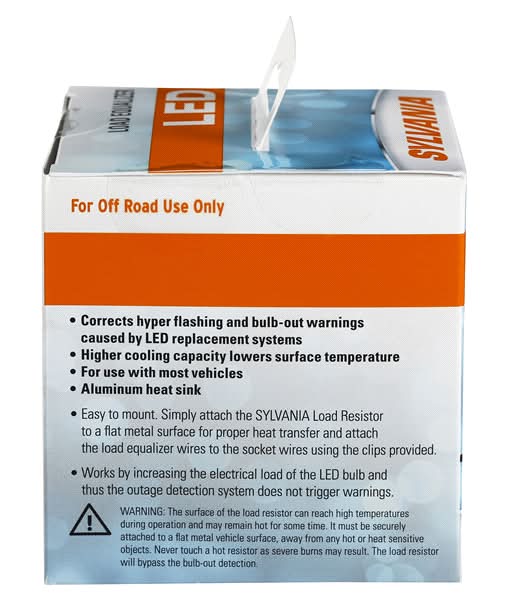 SYLVANIA load equalizers can be used to eliminate the hyper flash (higher frequency turn signal) caused by LED replacement bulbs in some vehicles. Easy to mount, simply attach the SYLVANIA load equalizer to a flat metal surface for proper heat transfer, then attach wires to those of socket with provided clips.