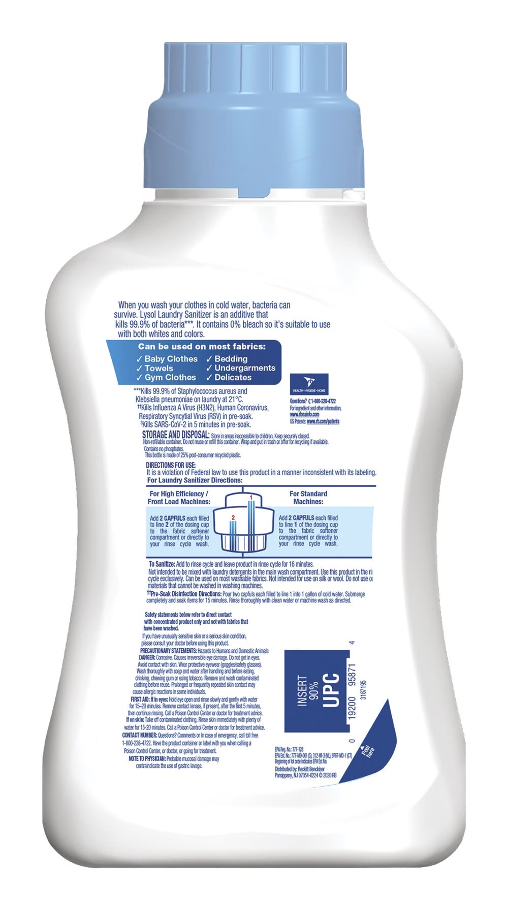 Our clothes are in constant contact with bacteria throughout our day-to-day activities, for example through contact with contaminated surfaces, other people and our own bodies. Bacteria can spread from one fabric to another in the laundry basket, from the washing-machine drum to the next load. Some of these bacteria can survive following the wash cycle. When it comes to certain laundry loads such as children's clothes or sportswear, you want to eliminate bacteria that may cause illnesses and create lingering bad smells. But detergents alone don't actually kill all bacteria. Introducing Lysol Laundry Sanitizer Free & Clear, an additive specially designed to kill 99.9% of bacteria in laundry when used as directed. Lysol Laundry Sanitizer Free & Clear is free from fragrance and free from dye. Simply add Lysol Laundry Sanitizer to your rinse cycle. It does not contain any chlorine bleach and even works in cold water so is safe to use on most fabrics including whites, colors and darks. Reckitt Benckiser, 399 Interpace Pkwy, Parsippany, NJ 07054