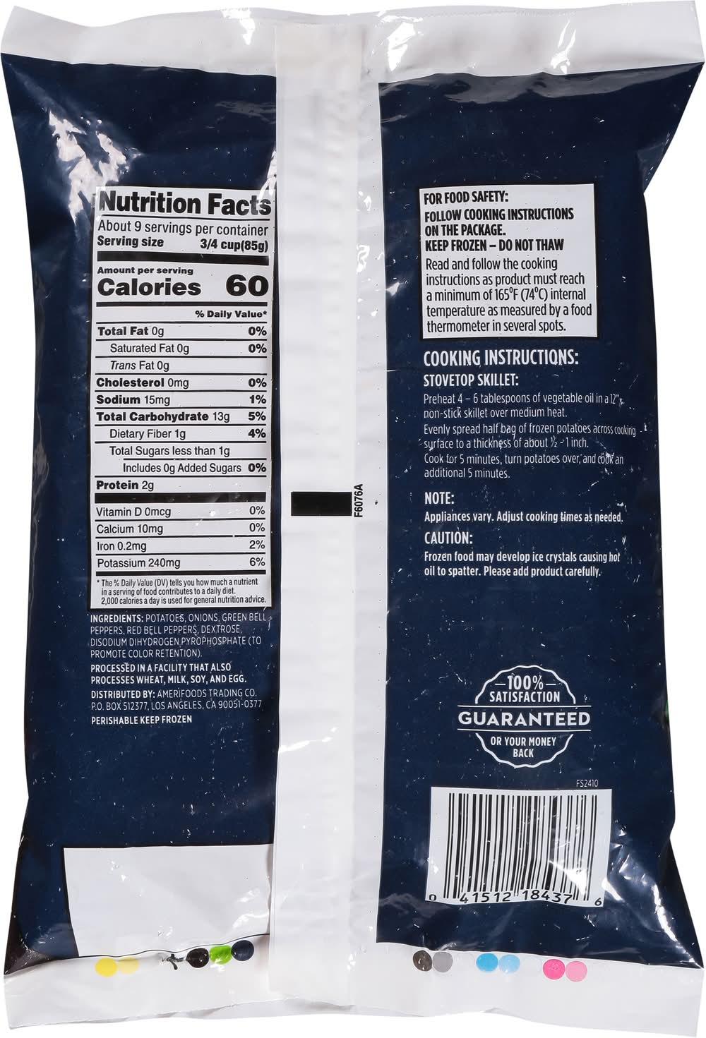 Potatoes, Onions, Green Bell Peppers, Red Bell Peppers, Dextrose, Disodium Dihydrogen Pyrophosphate (to Promote Color Retention) Contains: Wheat, Milk, Soybeans, Eggs