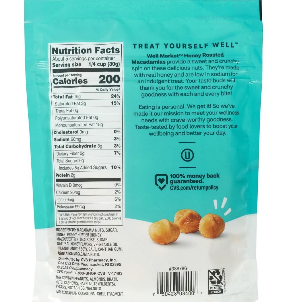 Well Market™ Honey Roasted Macadamias provide a sweet and crunchy spin on these delicious nuts. They’re made with real honey and are low in sodium for an indulgent treat. Your taste buds will thank you for the sweet and crunchy goodness with each and every bite! Eating is personal. We get it! So we’ve made it our mission to meet your wellness needs with crave-worthy goodness. Taste-tested by food lovers to boost your wellbeing and better your day. TREAT YOURSELF WELL™. Honey Roasted Gluten-free Keto 6 g net carbs per serving Low sodium NET WT 5oz. Gold Emblem and Gold Emblem Abound are now Well Market™ 100% money-back guarantee on Our CVS Brands. If you are not 100% satisfied with a CVS Pharmacy private brand product, you can return it for free (some exclusions apply*). For more details regarding Our CVS Brands return policy, please visit https://www.cvs.com/retail/help/return_policy.