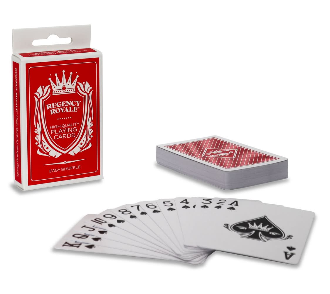 The Regency Royale Playing Cards offer the perfect all-around deck for any game. Made from high-quality, coated playing card stock, they are designed for easy shuffling and durability. Each deck includes 52 standard cards and 2 jokers. Easy Shuffle: The unique finish allows for effortless shuffling and dealing, ensuring a seamless game experience every time. High Quality: Made from high-quality card stock, our cards are designed to withstand countless games, ensuring they stay crisp and intact. Versatility: These cards are versatile for both playing games and completing learning exercises. They can also be used for performing magic tricks or other entertaining activities.