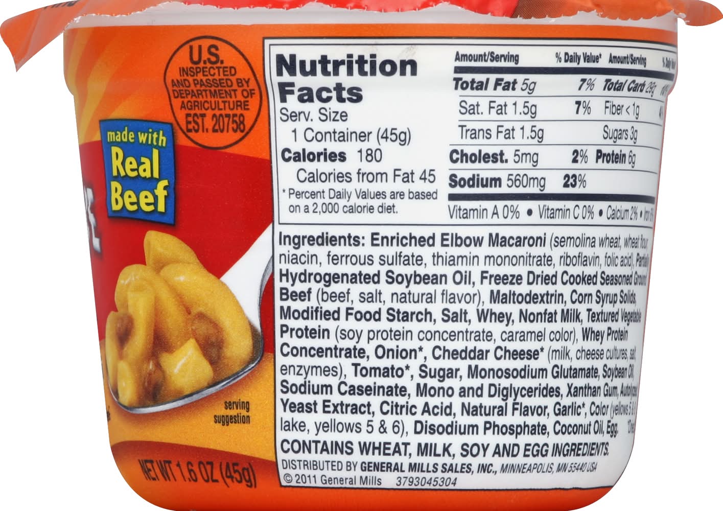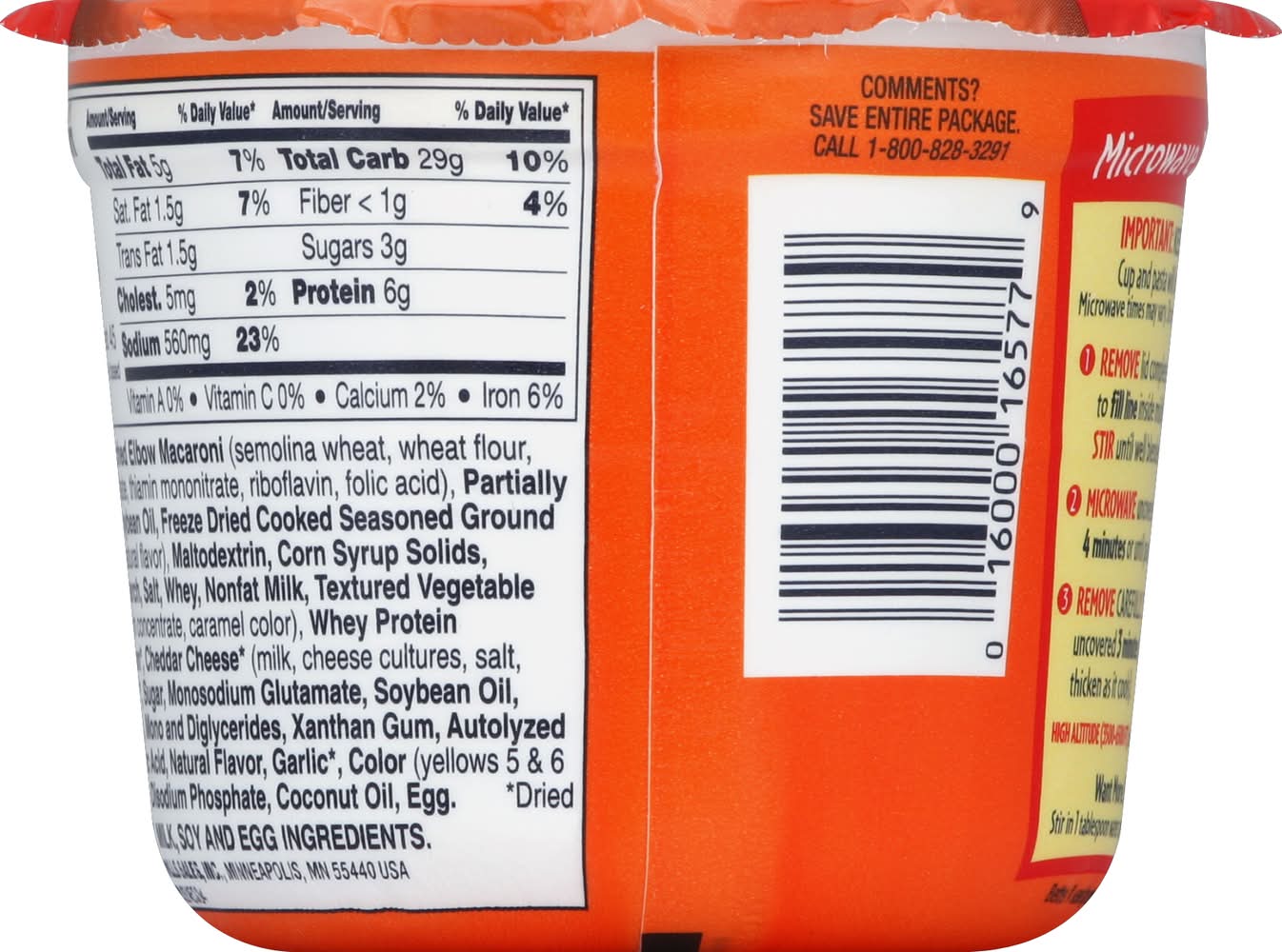 Enriched Elbow Macaroni (Semolina Wheat, Wheat Flour, Niacin, Ferrous Sulfate, Thiamin Mononitrate, Riboflavin, Folic Acid), Partially Hydrogenated Soybean Oil, Freeze Dried Cooked Seasoned Ground Beef (Beef, Salt, Natural Flavor), Maltodextrin, Corn Syrup Solids, Modified Food Starch, Salt, Whey, Nonfat Milk, Textured Vegetable Protein (Soy Protein Concentrate, Caramel Color), Whey Protein Concentrate, Onion (Dried), Cheddar Cheese (Dried) (Milk, Cheese Cultures, Salt, Enzymes), Tomato (Dried), Sugar, Monosodium Glutamate, Soybean Oil, Sodium Caseinate, Mono and Diglycerides, Xanthan Gum, Autolyzed Yeast Extract, Citric Acid, Natural Flavor, Garlic (Dried), Color (Yellows 5 & 6 Lake, Yellow 5 & 6), Disodium Phosphate, Coconut Oil, Egg Contains: Milk, Eggs, Soybeans, Wheat