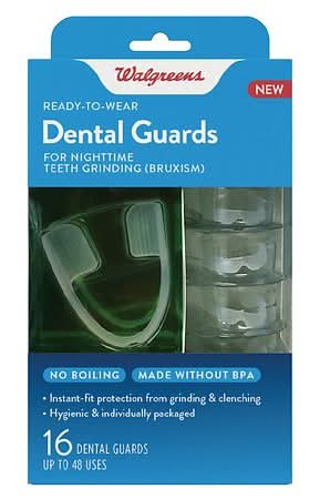 Walgreens Ready To Wear Dental Guards come in a pack of 16 and offer protection against nighttime teeth grinding. Each guard is individually packaged and ready for immediate use without the need for boiling, cutting, or molding. They are versatile and can be used on either the upper or lower teeth, and are manufactured in China.