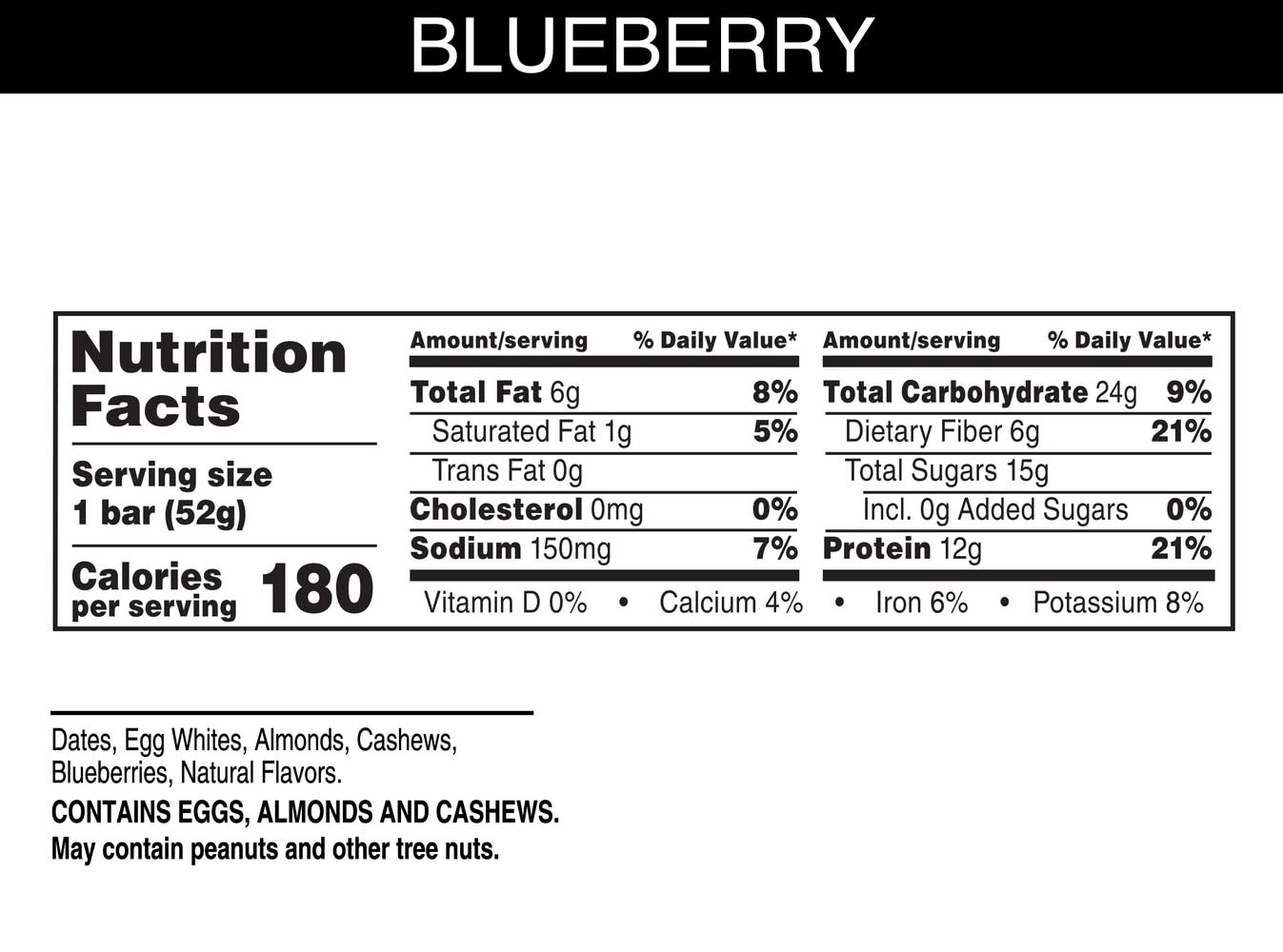 Ingredients: Dates, Egg Whites, Almonds, Cashews, Blueberries, Natural Flavors. Contains: Contains eggs, almonds and cashews. may contain peanuts and other tree nuts.