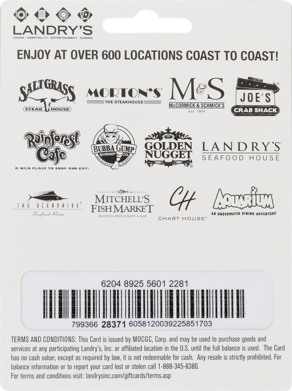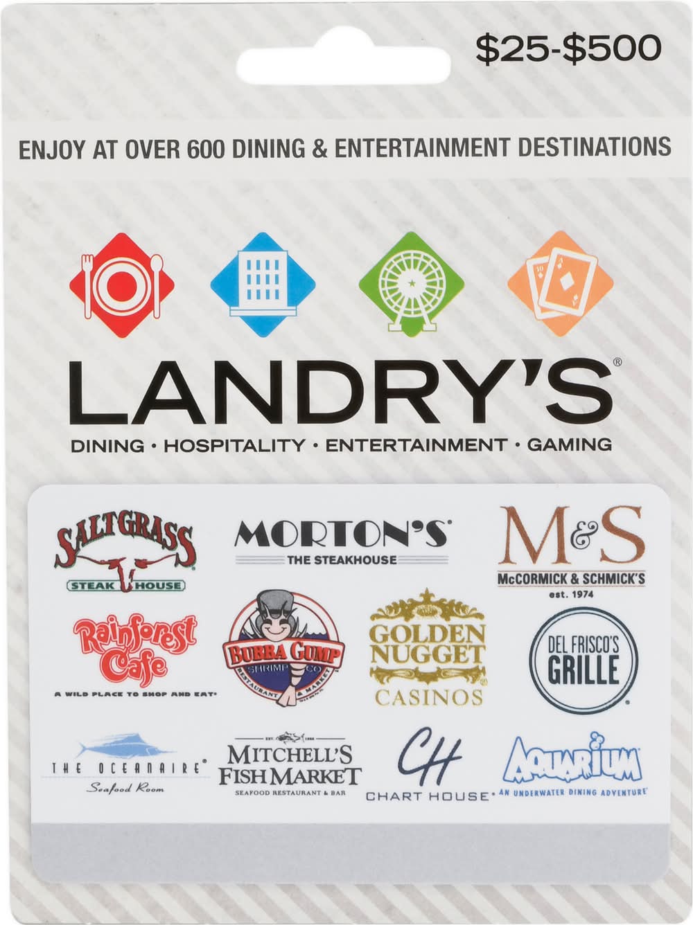Your Landry's Gift Card delivery options may vary depending on where you are in a city. Enter your address to browse Landry's Gift Card delivery options near you.