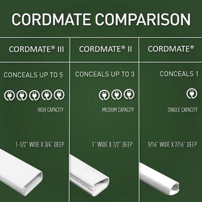 The mess and clutter of cords is no more with the Wiremold CordMate II Cord Cover system. Its stylish design complements most interior decors and is perfect for hiding small bundles of home entertainment cabling, speaker wires, TV/video cabling and home office wiring. Combine with CordMate II Channel and a variety of fittings for a customized project. Color: White