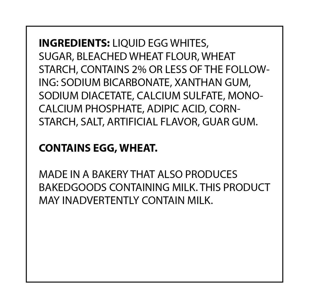 LIQUID EGG WHITES, SUGAR, BLEACHED WHEAT FLOUR, WHEAT STARCH, CONTAINS 2% OR LESS OF THE FOLLOWING: SODIUM BICARBONATE, XANTHAN GUM, SODIUM DIACETATE, CALCIUM SULFATE, MONOCALCIUM PHOSPHATE, ADIPIC ACID, CORNSTARCH, SALT, ARTIFICIAL FLAVOR, GUAR GUM. CONTAINS EGG, Contains: <p>Contains egg, wheat.</p><p>Allergy Advisory: Produced on the same bakery equipment as baked goods containing milk, nuts or seeds. Therefore, this product may inadvertently contain milk, nuts or seeds to which some people may be allergic.</p>
