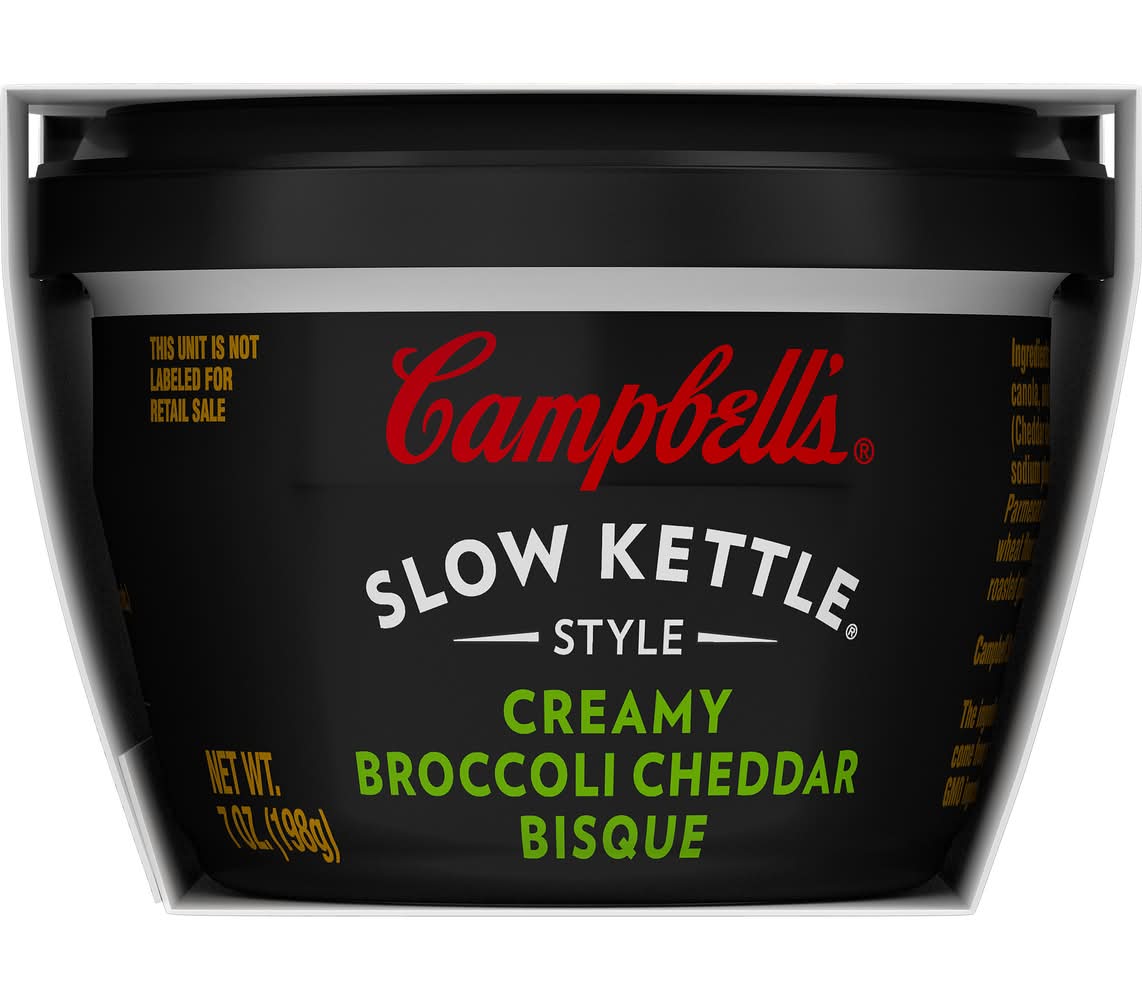 Campbell's® Slow Kettle® Style Creamy Broccoli Cheddar Bisque cups bring indulgence in an on the go soup that's a delicious pairing to liven up your lunch routine. We've bundled up a creamy rendition of our timeless broccoli cheddar soup recipe into a convenient microwavable soup cup that's perfectly portioned as a lunch snack. Smooth, creamy and cheesy with broccoli simmered to perfection, pair the restaurant-quality taste with a sandwich or salad for lunch. Ready in just minutes, you'll find comfort by the spoonful wherever life takes you. Campbell Soup Company, Camden,NJ,08103-1701