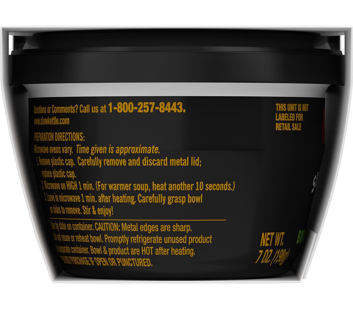 Directions for use: Microwave ovens vary. Time given is approximate. 1. Remove plastic cap. Carefully remove and discard metal lid, replace plastic cap. 2. Microwave on high 1 min. (For warmer soup, heat another 10 seconds). 3. Leave in microwave 1 min after heating. Carefully grasp bowl on sides to remove. Enjoy! Caution: Metal edges are sharp. Do not reuse or reheat bowl. Bowl & product are hot after heating. Promptly refrigerate unused product in separate container. Use by date on container.Do not purchase if open or punctured. Storage recommendation: Promptly refrigerate unused product in separate container.