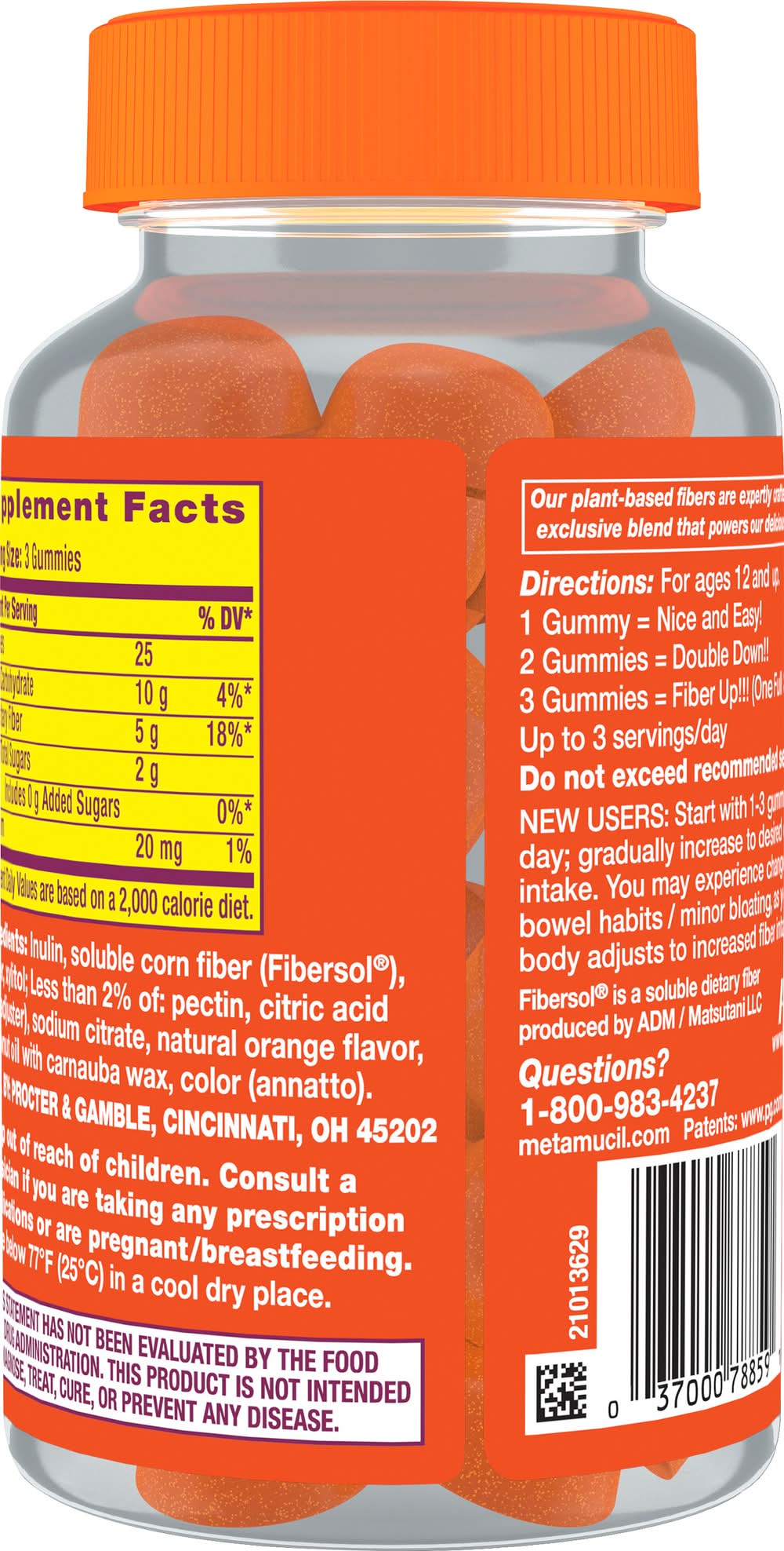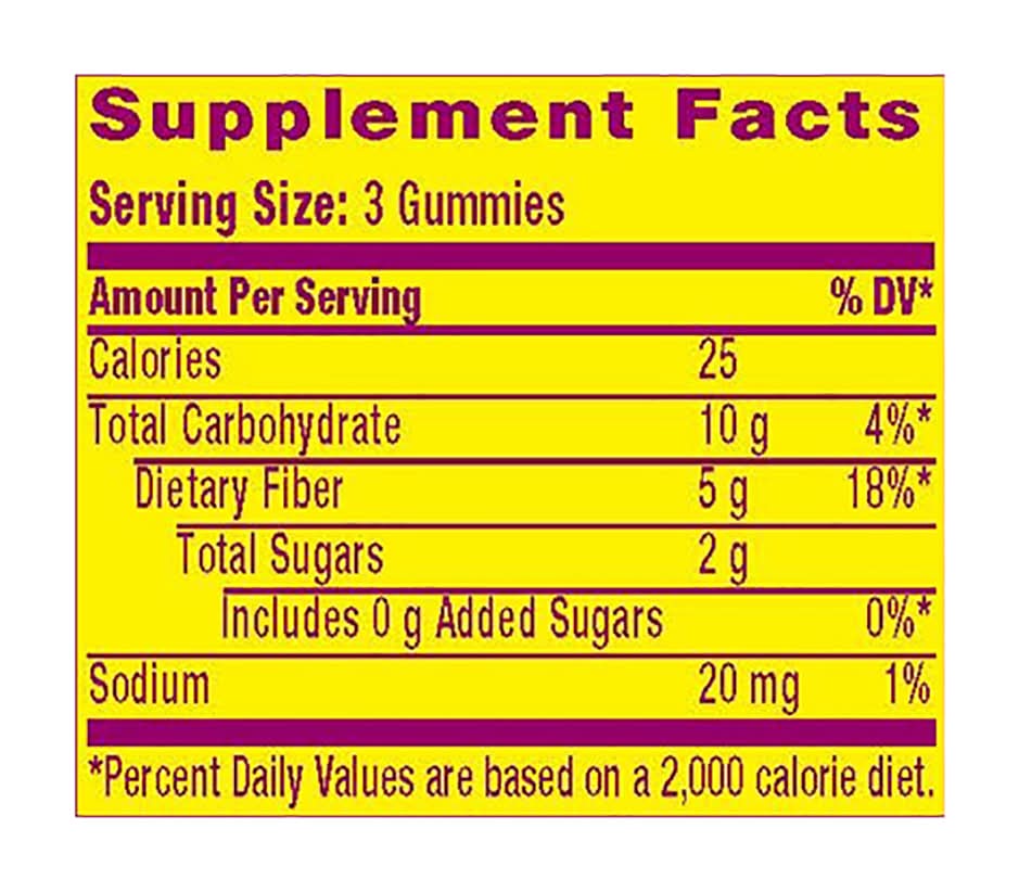 Fiber Supplement. Naturally flavored. 5 g of fiber per serving. Not a low calorie food. No sugar added. Promotes digestive health. Prebiotic plant-based fiber blend. Our plant-based fibers are expertly crafted into the exclusive blend that powers our delicious gummy. Fibersol is a soluble dietary fiber produced by ADM / Matsutani LLC. Size: 72 CT