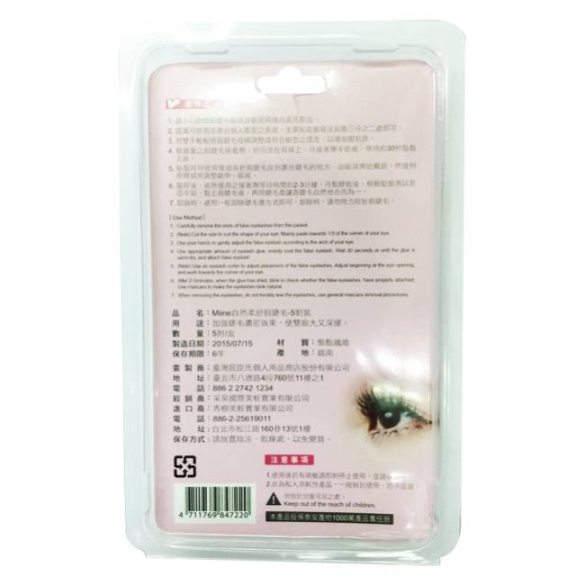 Directions for use: 1. 請小心的將假睫毛眼頭及眼尾兩端自底托取出 2. 建議可修剪至適合個人眼型之長度主要貼在眼尾往前推三分之二處即可 3. 用雙手輕輕將假睫毛母線調整成符合眼型之弧度以增加服貼度 4. 取適量之假睫毛接著劑均勻塗在母線上待接著劑半乾後等待約30秒貼黏上妝 5. 貼黏時可使用彎頭夾把假睫毛放到靠近睫毛的地方由眼頭開始戴起然後利用彎頭夾調整眼中,眼尾 6. 黏好後依所使用之接著劑等待時間約2-3分鐘待黏膠乾後輕輕眨眼測試是否牢固黏上假睫毛後再用睫毛膏讓真睫毛自然地合而為一 Storage recommendation: 室溫