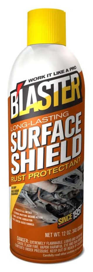 Blaster Surface Shield is the best defense for fighting rust. The lanolin-based formula provides complete corrosion protection for metal parts for up to 2-years. Plus, it's non-toxic, safe and low-VOC. It goes on uniformly, providing even surface coverage and build, which means you'll avoid the peaks and valleys that allow moisture to sneak in. And while it's great for steel, it won't harm plastic, rubber, glass or wiring. Bonus features include lubricity (lubrication is a Blaster staple, so naturally we perfected the balance of ensuring steady operation of your project as we protect it from corrosion) and a mild cedar fragrance (so you can protect your project without stinking up your garage).