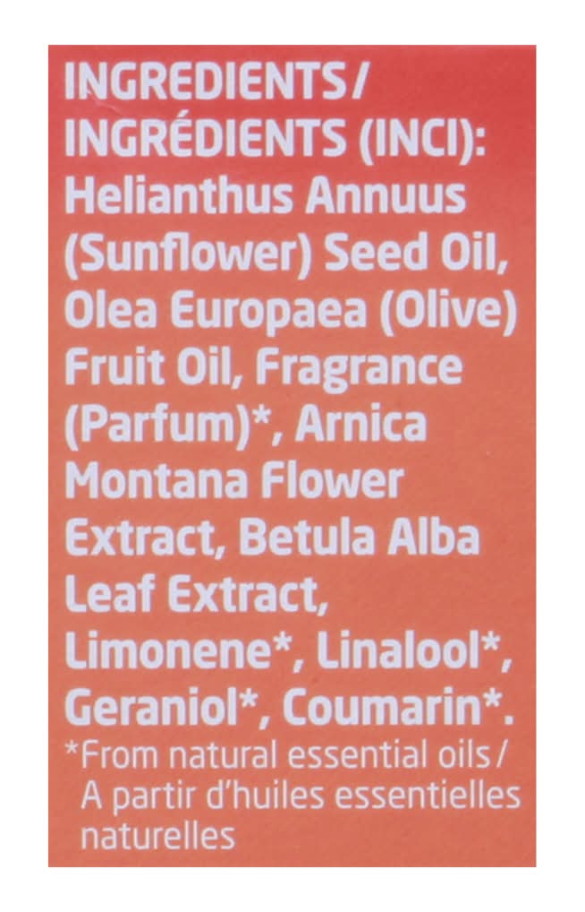 Helianthus Annuus (Sunflower) Seed Oil, Olea Europaea (Olive) Fruit Oil, Fragrance (Parfum) (from Natural Essential Oils), Arnica Montana Flower Extract, Betula Alba Leaf Extract, Limonene (from Natural Essential Oils), Linalool (from Natural Essential Oils), Geraniol (from Natural Essential Oils), Coumarin (from Natural Essential Oils) Additives: None