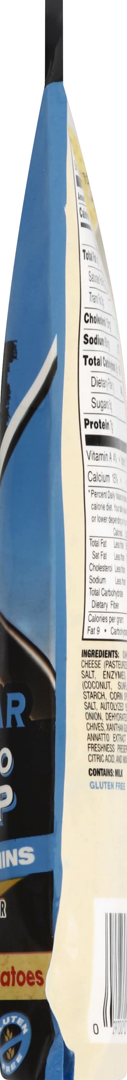 Idaho Potatoes, Cheddar Cheese (Pasteurized Milk, Cheese Cultures, Salt, Enzymes), Whey, Vegetable Oil (Coconut, Sunflower), Modified Food Starch, Corn Syrup Solids, Maltodextrin, Salt, Autolyzed Yeast Extract, Dehydrated Onion, Dehydrated Garlic, Natural Flavors, Chives, Xanthan Gum, Paprika Extract (Color), Annatto Extract (Color), Monoglycerides, Freshness Preserved by Sodium Bisulfite, Citric Acid, and Mixed Tocopherols Contains: Milk