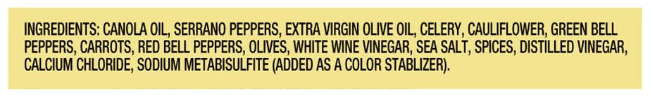 Ingredients: Canola Oil, Serrano Peppers, Extra Virgin Olive Oil, Celery, Cauliflower, Green Bell Peppers, Carrots, Red Bell Peppers, Olives, White Wine Vinegar, Sea Salt, Spices, Distilled Vinegar, Calcium Chloride, Sodium Metabisulfite (Added as a Color Stabilizer) Contains: Celery