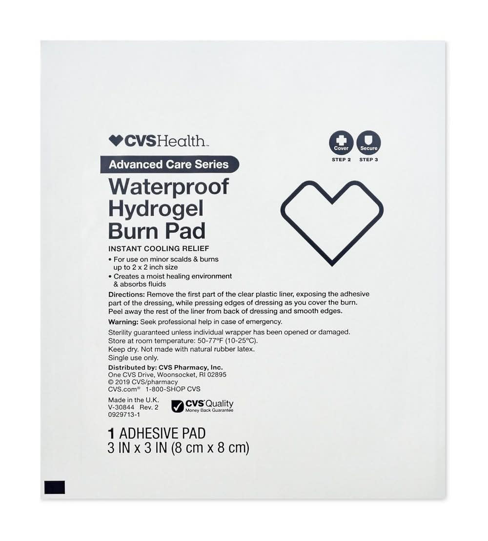 Invisible coverage Helps maintain a moist environment for optimal healing Won't stick to the burn Multiple day wear time Sterility guaranteed unless individual wrapper has been opened or damaged. Not made with natural rubber latex. SINGLE USE ONLY CVS/pharmacy Hydrogel Burn Pads Combine hydrogel and hydrocolloid technology with a super absorbent polymer. Size: 3x3 in