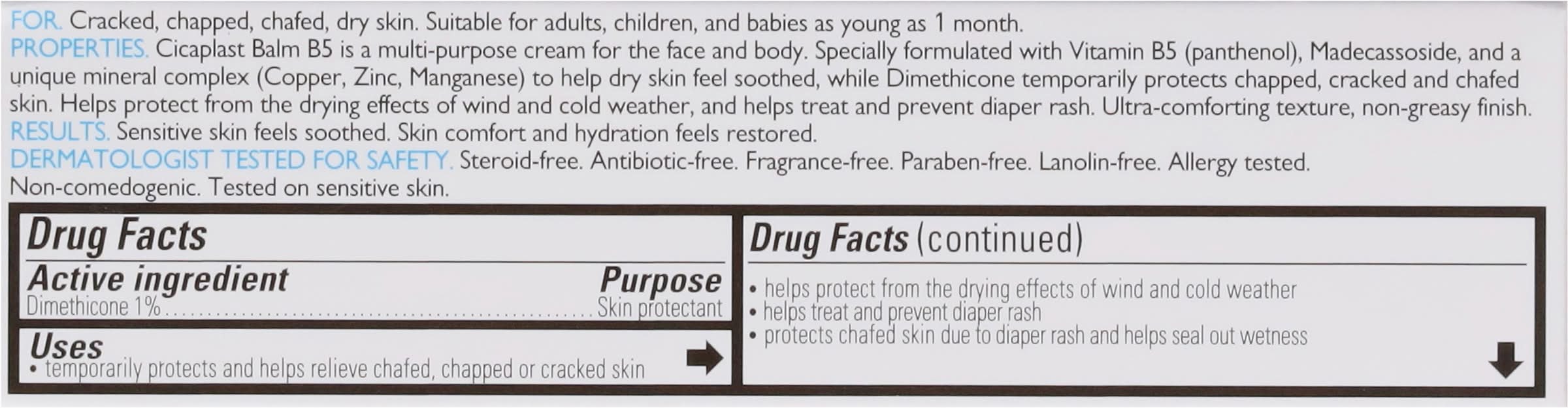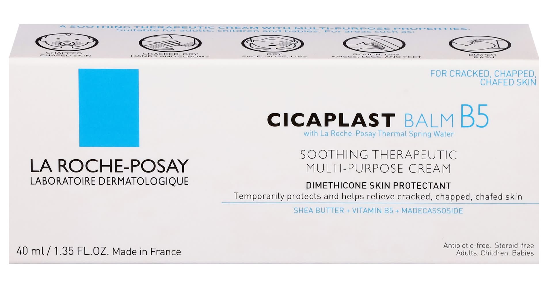 La Roche-Posay Cicaplast Balm B5 is a multi-purpose soothing cream for cracked, chapped, chafed skin and dry skin irritations that helps hydrate and soothe. Non-greasy skin protectant helps to relieve dry, rough skin. Hydrating therapeutic cream protects chafed skin due to diaper rash and helps seal out wetness, while helping to treat and prevent diaper rash. Suitable for adults, children and babies 1 week and up. Paraben-free, fragrance-free, dermatologist tested, and allergy tested.Key Ingredients:- Vitamin B5 (Panthenol) soothes dry, rough skin- Shea Butter and Glycerin help to nourish skin and visibly reduce the sign of irritation caused by dryness- [Madecassoside] + [Copper - Zinc - Maganese] help to visibly reduce the appearance of dry, irritated skin.Brand Story:Recommended by 90,000 dermatologists worldwide, La Roche-Posay offers unique daily skincare developed using a strict formulation charter and stringent clinical testing for efficacy and safety, even on sensitive skin. Multi-purpose cream helps relieve and protect cracked, chapped, chafed skin Soothes visible signs of dry skin irritations and sensitive skin Provides daily relief for dry to very dry skin Protects from the drying effects of wind and cold Non-greasy, fast-absorbing, non-irritating formula Lotion for dry skin can be applied to body, face, and lips Paraben-free, fragrance free, allergy tested and dermatologist tested