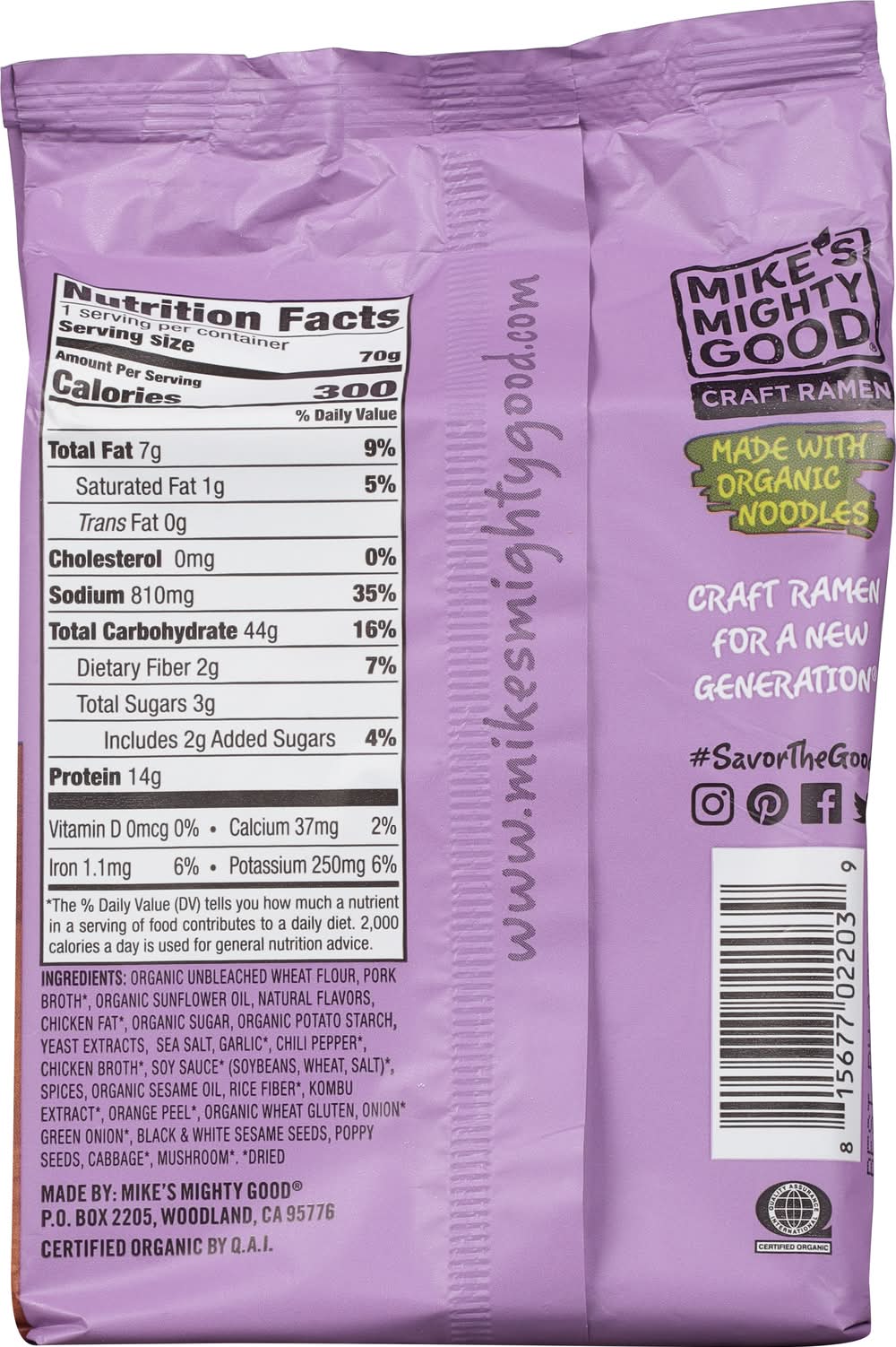 Organic Unbleached Wheat Flour, Pork Broth (Dried), Organic Sunflower Oil, Natural Flavors, Chicken Fat (Dried), Organic Sugar, Organic Potato Starch, Yeast Extracts, Sea Salt, Garlic (Dried), Chili Pepper (Dried), Chicken Broth (Dried), Soy Sauce (Dried) (Soybeans, Wheat, Salt) (Dried), Spices, Organic Sesame Oil, Rice Fiber (Dried), Kombu Extract (Dried), Orange Peel (Dried), Organic Wheat Gluten, Onion (Dried) Green Onion (Dried), Black & White Sesame Seeds, Poppy Seeds, Cabbage (Dried), Mushroom (Dried) Contains: Wheat, Gluten, Sesame, Soybeans