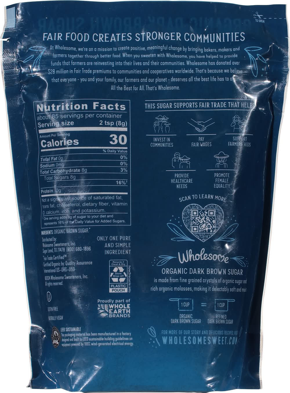 Organic Dark Brown Sugar • Wholesome Sweeteners, Inc., Sugar Land,TX,77478 • Packaging: Reusable