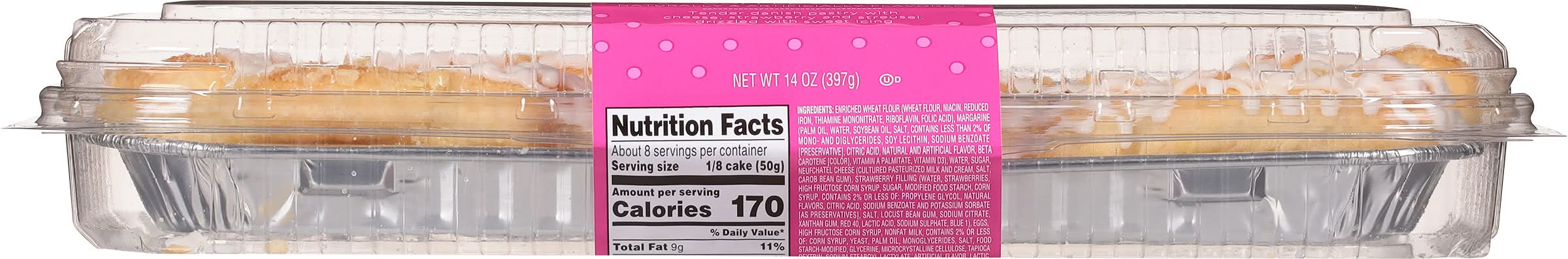 Enriched Wheat Flour (Wheat Flour, Niacin, Reduced Iron, Thiamine Mononitrate, Riboflavin, Folic Acid), Margarine (Palm Oil, Water, Soybean Oil, Salt, Contains Less than 2% of Mono- and Diglycerides, Soy Lecithin, Sodium Benzoate [Preservative], Citric Acid, Natural and Artificial Flavor, Beta Carotene [Color], Vitamin A Palmitate, Vitamin D3), Water, Sugar, Neufchatel Cheese (Cultured Pasteurized Milk and Cream, Salt, Carob Bean Gum), Strawberry Filling (Water, Strawberries, High Fructose Corn Syrup, Sugar, Modified Food Starch, Corn Syrup, Contains 2% or Less of: Propylene Glycol, Natural Flavors, Citric Acid, Sodium Benzoate and Potassium Sorbate [as Preservatives], Salt, Locust Bean Gum, Sodium Citrate, Xanthan Gum, Red 40, Lactic Acid, Sodium Sulphate, Blue 1), Eggs, High Fructose Corn Syrup, Nonfat Milk, Contains 2% or Less of: Corn Syrup, Yeast, Palm Oil, Monoglycerides, Salt, Food Starch-Modified, Glycerine, Microcrystalline Cellulose, Tapioca Dextrin, Sodium Stearoyl Lactylate, Artificial Flavor, Lactic Acid, Whey, Potassium Sorbate (Preservative), Calcium Lactate, Soybean Oil, Lemon Juice Concentrate, Agar, Soy Lecithin, Cellulose Gum, Baking Soda, Enzymes, Titanium Dioxide (for Color), Xanthan Gum, Ascorbic Acid Contains: Wheat, Milk, Eggs, Soybeans, Corn, Tree Nuts, Almonds, Tree Nuts, Pecans, Tree Nuts, Coconuts, Tree Nuts, Walnuts/Butternuts