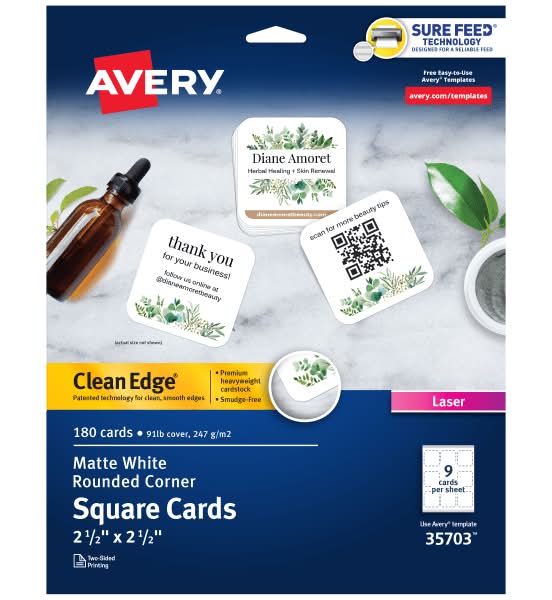 Make sure your cards stand out with Avery square cards with rounded corners. This pack of first-rate customizable business cards is made from quality cardstock with a weight of 91lbs / 247gsm, and offers an impressively substantial look and feel, while the curved corners help avoid snagging and creasing. If you need professional quality business cards, customer loyalty cards, appointment reminder cards, product price tags or more, these 2.5" x 2.5" cards are an exceptional way to stand out from the crowd. These white business cards have innovative Clean Edge technology for quick and easy separation, giving you the cleanest, smoothest edges of any business card on the market. Also, proprietary Avery Sure Feed technology helps reduce misalignments, minimize paper jams, and avoid wasted projects when printing on your laser printer. Easily customize your own business cards, loyalty cards for business, RSVP cards and more using Avery Design & Print Online and the hundreds of available templates and designs. Enjoy premium quality custom business cards featuring Clean Edge technology that allows cards to be snapped apart easily, leaving behind clean, smooth edges. Each sheet of business cards features proprietary Avery Sure Feed technology designed to help with alignment and reduce printer jams. Create eye-catching designs from unique, square-shaped cards with curved corners. Perfect for small business cards, RSVP cards, rewards cards and more. Print beautiful, double-sided cards on sheets optimized for laser printers. Item includes 20 printable sheets with a total of 180 blank 2.5" x 2.5" cards. Paper with recycled content that may have originally been chlorine bleached, but was not re-bleached with chlorine compounds and any virgin content is totally chlorine free. UL Claim Validation - UL environmental claim validations lend third-party credibility to single-attribute environmental claims. • Pack size: 180 • Color: White