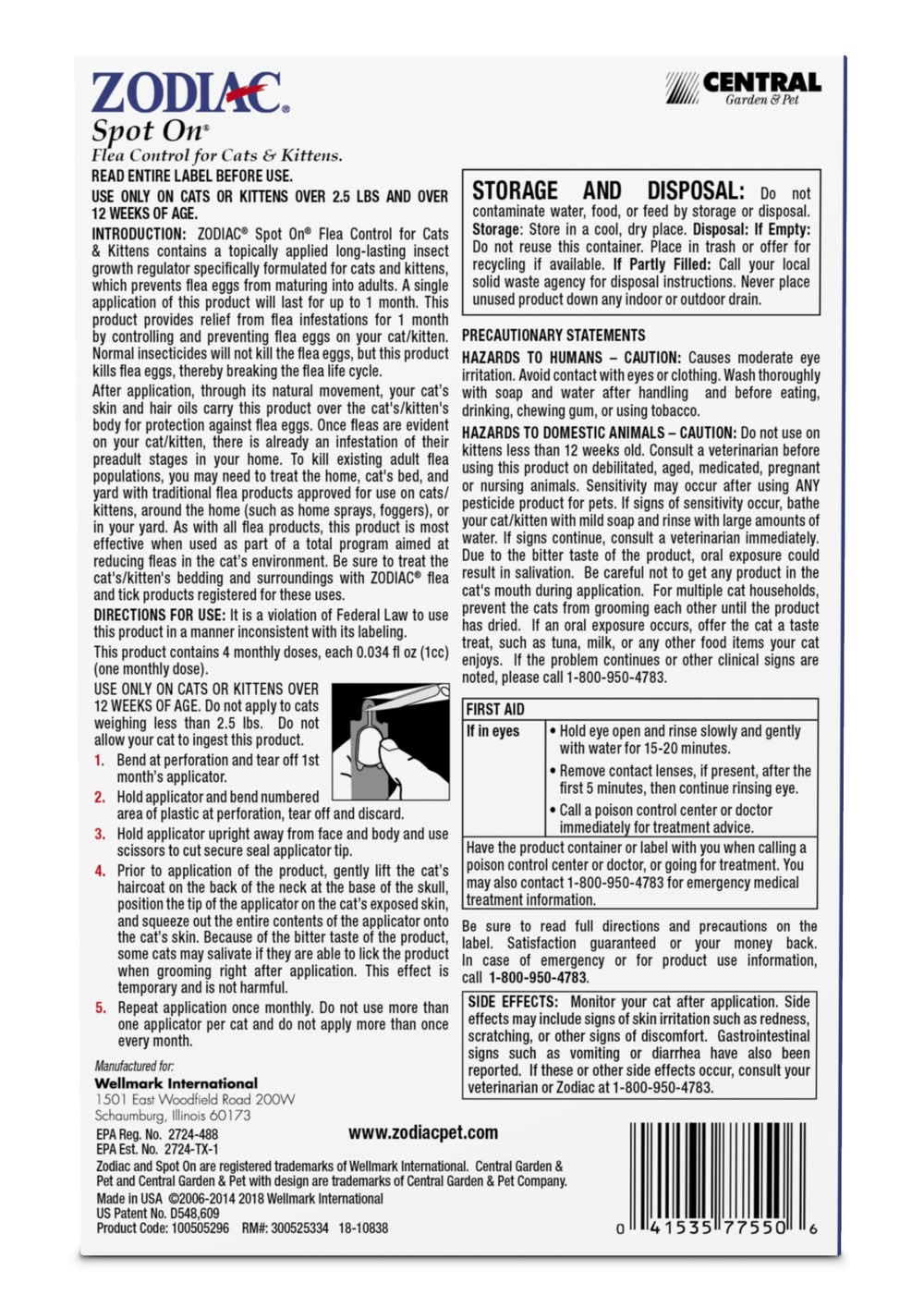 Zodiac Spot on Plus Flea & Tick Control For Cats (0.24 fl oz, 4 ct)